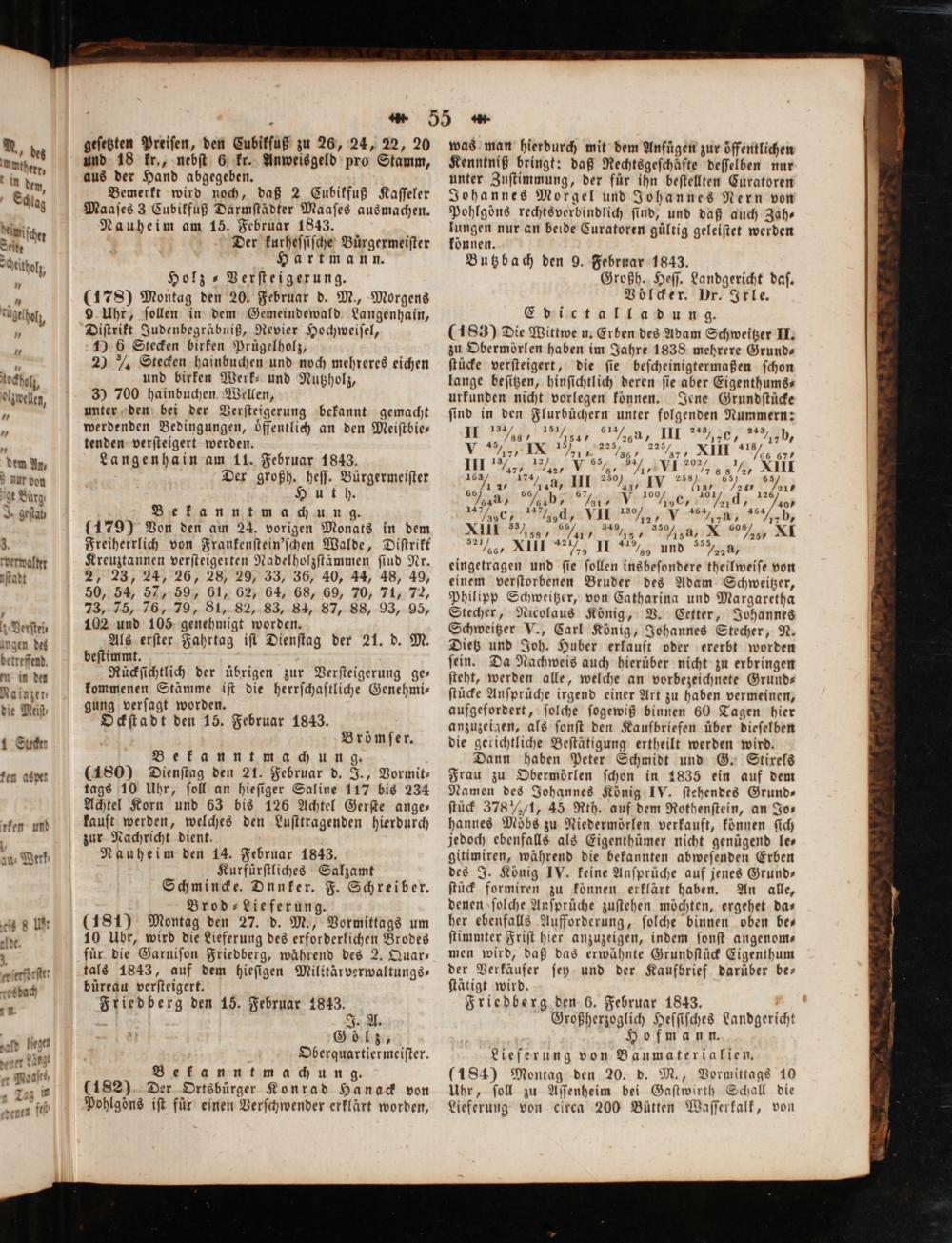 Der kurheſſiſche Bürgermeiſter Hartmann. Holz ⸗Verſteigerung. (178) Montag den 20. Februar d. M., Morgens 9 Uhr, ſollen in dem Gemeindewald Langenhain, Diſtrikt Judenbegräbniß, Revier Hochweiſel, 1 6 Stecken birken Prügelholz, 29 J. Stecken hainbuchen und noch mehreres eichen und birken Werk- und Nutzholz, 3) 700 hainbuchen Wellen, unter den bei der Verſteigerung bekannt gemacht werdenden Bedingungen, oͤffentlich an den Meiſtbie— tenden verſteigert werden. Langenhain am 11. Februar 1843. Der großh. heſſ. Burgermeiſter N Bekanntmachung. 1179) Von den am 24. vorigen Monats in dem Freiherrlich von Frankenſtein'ſchen Walde, Diſtrikt Kreuztannen verſteigerten Nadelholzſtämmen ſiud Nr. 2, 23, 24, 26, 28, 29, 33, 36, 40, 44, 48, 49, 50, 54, 57, 59, 61, 62, 64, 68, 69, 70, 71, 72, 73, 75, 76, 79, 81, 82, 83, 84, 87, 88, 93, 95, 102 und 105 genehmigt worden.