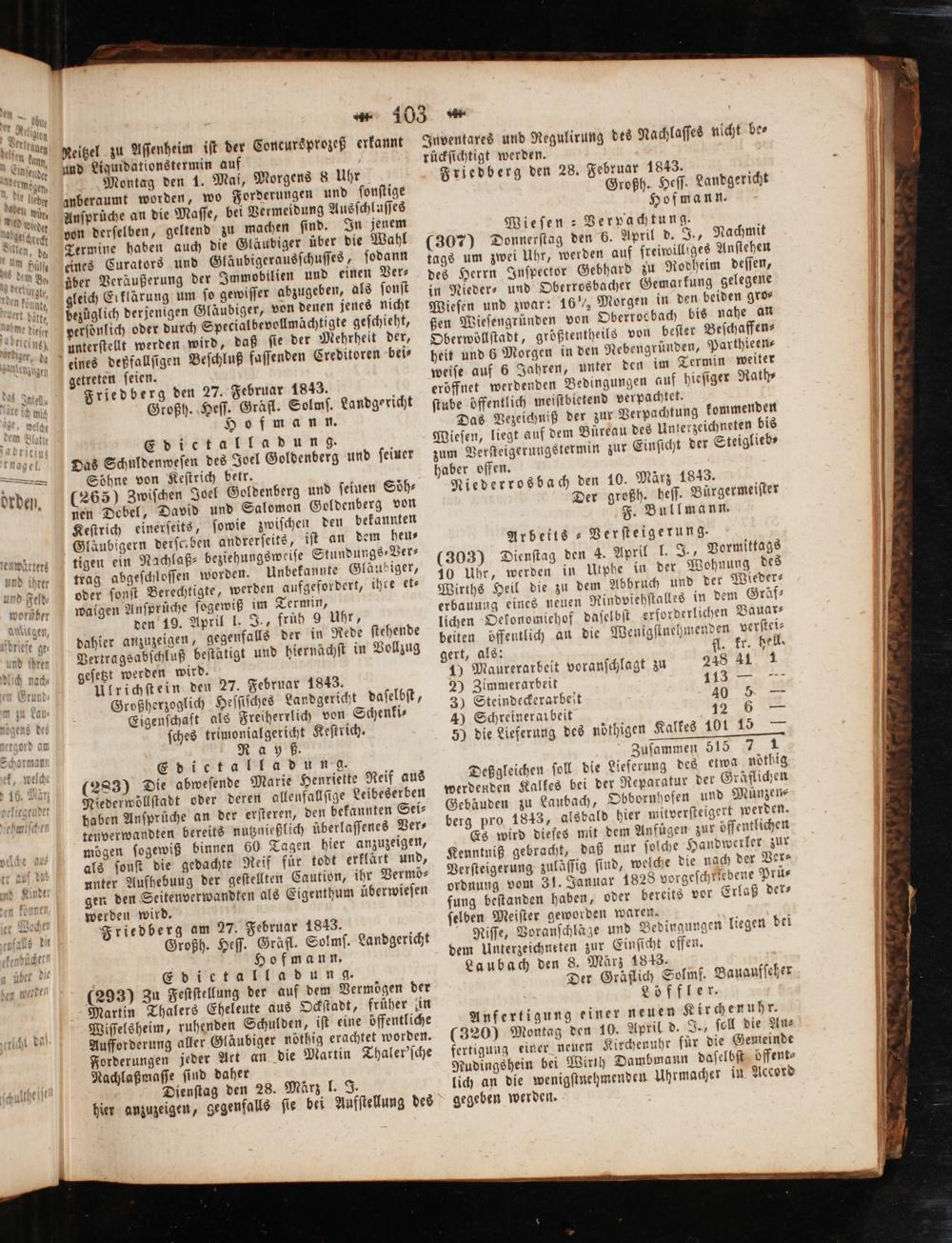 Juventares und Regulirung des Nachlaſſes nicht be⸗ rückſichtigt werden. Friedberg den 28. Februar 1843.