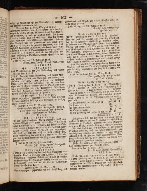 Niederrosbach den 10. März 1843. 8 Der großh. heſſ. Bürgermeiſter F. Bullmann. Arbeits-Verſteigerung.