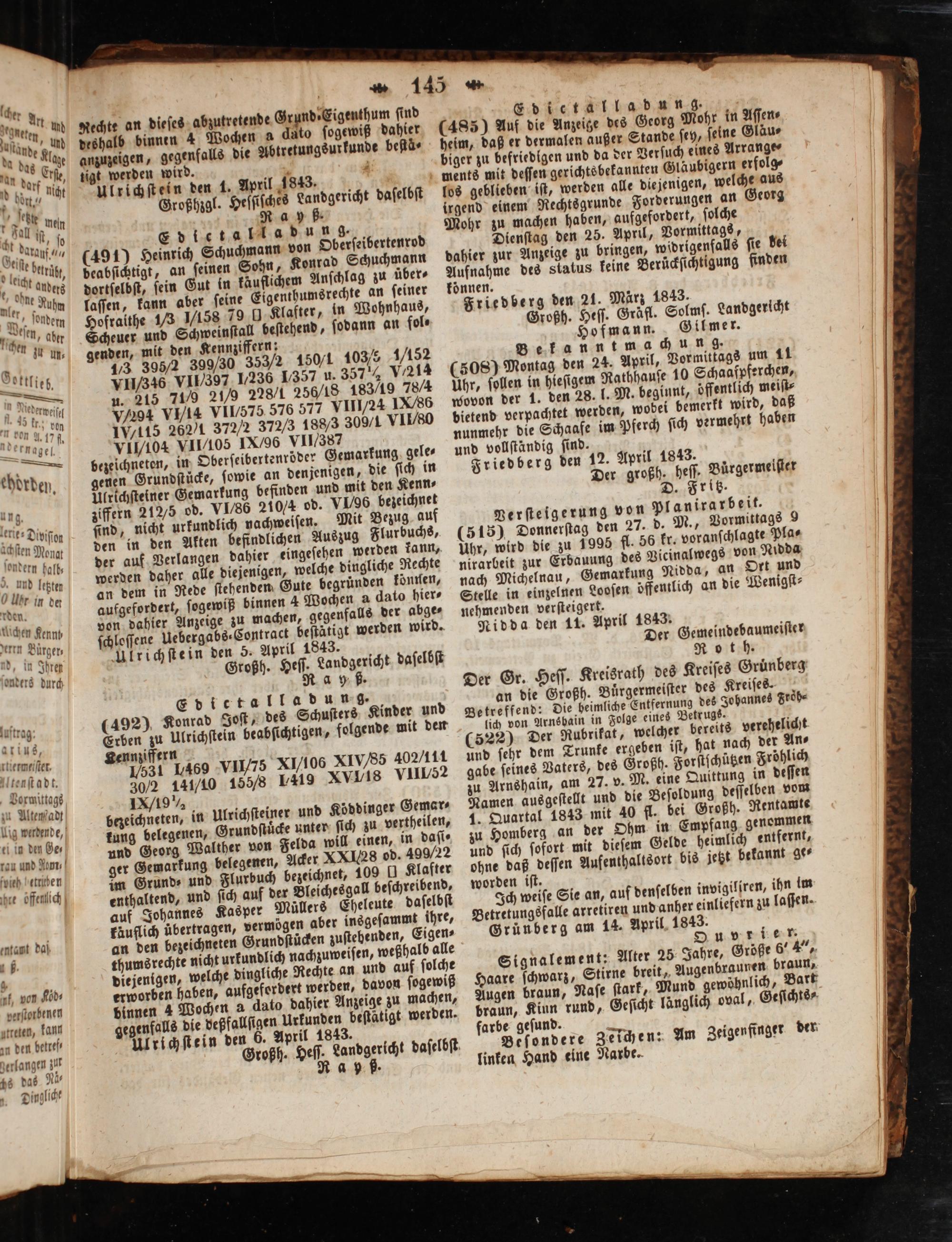 Rechte an dieſes abzutretende Grund ⸗Eigenthum ſind deshalb binnen 4 Wochen a dato ſogewiß dahier anzuzeigen, gegenfalls die Abtretungsurkunde beſta⸗ tigt werden wird. Ulrichſtein den 1. April 1843. Großhzgl. Heſſiſches Landgericht daſelbſt Ray ß.