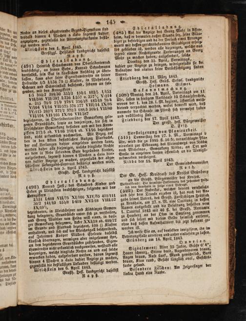 Edict a (492) Konrad Joſt, Erben zu Ulrichſtein beabſichtigen, Kennziffern 1531 L469 VI/½75 XL/106 XIVVS5 402/111 30% 14½/0 155/8 1419 XVL/I8 VIIL52 1/19 bezeichneten, kung belegenen, und Georg Walther von Felda ger Gemarkung belegenen, A im Grund⸗ und Flurbuch bezeichnet, 109( Klafter enthaltend, und ſich auf der Bleichesgall beſchreibend, auf Johannes Kasper Müllers Eheleute daſelbſt käuflich übertragen, vermögen aber insgeſammt ihre, an den bezeichneten Grundſtücken zuſtebenden, Eigen⸗ thums rechte nicht urkundlich nachzuweiſen, weßhalb alle diejenigen, welche dingliche Rechte an und auf ſolche erworben haben, aufgefordert werden, davon ſogewiß binnen 4 Wochen a dato dahier Anzeige zu machen, gegenfalls die veßfallſigen Urkunden beſtätigt werden. Ulrichſtein den 6. April 1843.
