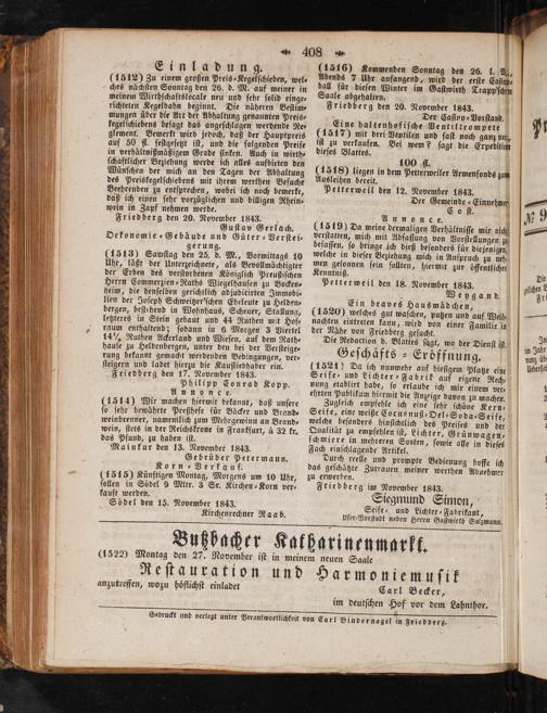 ches nächſten Sonntag den 26. d. M. auf meiner in meinem Wirthſchaftslocale neu und ſehr ſolid einge⸗ richteten Kegelbahn beginnt. Die näheren Beſtim⸗ mungen uber die Art der Abhaltung genannten Preis⸗ kegelſchiebens beſagt das angeſchlagen werdende Re⸗ glement. Bemerkt wird jedoch, daß der Hauptpreis auf 50 fl. feſtgeſetzt iſt, und die folgenden Preiſe in verhältnißmäßigem Grade ſinken. Auch in wirth⸗ ſchaftlicher Beziehung werde ich alles aufbieten den Wüsſchen der mich an den Tagen der Abhaltung des Preiskegelſchiebens mit ihrem werthen Beſuche Beehrenden zu entſprechen, wobei ich noch bemerke, daß ich einen ſehr vorzüglichen und billigen Rhein⸗ wein in Zapf nehmen werde. Friedberg den 20. November 1843. Guſtav Gerlach. Oekonomie⸗Gebäude und Güter⸗ Verſtei⸗ gerung. (1513) Samiſtag den 25. d. M., Vormittags 10 Uhr, läßt der Unterzeichnete, als Bevollmächtigter der Erben des verſtorbenen Königlich Preußiſchen Herrn Commerzien⸗Raths Wiegelhauſen zu Bocken⸗ heim, die denſelben gerichtlich adjudicirten Immobi⸗ lien der Joſeph Schweitzer'ſchen Eheleute zu Helden⸗ bergen, beſtehend in Wohnhaus, Scheuer, Stallung, letzteres in Stein gebaut und 44 Ruthen mit Hof⸗ raum enthaltend; ſodann in 6 Morgen 3 Viertel 14¼½ Ruthen Ackerland und Wieſen, auf dem Rath⸗ hauſe zu Heldenbergen, unter den bei der Verſteige⸗ rung bekannt gemacht werdenden Bedingungen, ver⸗ ſteigern und ladet hierzu die Kaufliebhaber ein. Friedberg den 17. November 1843. Philipp Conrad Kopp. Annonce. (4514) Wir machen hiermit bekannt, daß unſere ſo ſehr bewährte Preßhefe für Bäcker und Brand⸗ weinbrenner, namentlich zum Mehrgewinn an Brand⸗ wein, ſtets in der Reichskrone in Frankfurt, à 32 kr. das Pfund, zu haben iſt. Mainkur den 13. November 1843. Gebrüder Petermann. Korn ⸗ Verkauf. (1515) Kuͤnftigen Montag, Morgens um 10 Uhr, ſollen in Södel 9 Mltr. 3 Sr. Kirchen⸗Korn ver⸗ kauft werden. Sôdel den 15. November 1843.