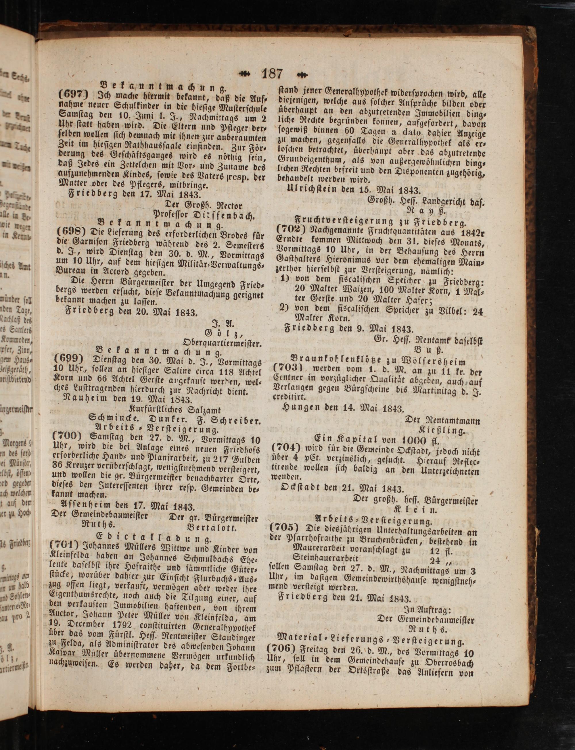 Friedberg den 20. Mai 1843. J. A. G ö lz, Oberquartiermeiſter. Bekanntmachung. (699) Dienſtag den 30. Mai d. J., Vormittags 10 Uhr, ſollen an hieſiger Saline circa 118 Achtel Korn und 66 Achtel Gerſte angekauft werden, wel— ches Luſttragenden hierdurch zur Nachricht dient. Nauheim den 19. Mai 1843. Kurfurſtliches Salzamt Schmincke. Dunker. F. Schreiber. Arbeits ⸗ Verſteigerung. (700) Samſtag den 27. d. M., Vormittags 10 Uhr, wird die bei Anlage eines neuen Friedhofs erforderliche Hand- und Planirarbeit, zu 217 Sulden 36 Kreuzer verüberſchlagt, wenigſtnehmend verſteigert, und wollen die gr. Bürgermeiſter benachbarter Orte, dieſes den Intereſſenten ihrer reſp. Gemeinden be⸗ kannt machen. Aſſenheim den 17. Mai 1843. Der Gemeindebaumeiſter Der gr. Buͤrgermeiſter Ruths. Bertalott. Edictalladung (701) Johannes Müllers Wittwe und Kinder von Kleinfelda haben an Johannes Schmulbachs Ehe⸗ leute daſelbſt ihre Hoftaithe und ſämmtliche Güter⸗ ſtücke, worüber dahier zur Einſicht Flurbuchs-Aus— zug offen liegt, verkauft, vermögen aber weder ihre Eigenthumsrechte, noch auch die Tilgung einer, auf den verkauften Immobilien haftenden, von ihrem Auctor, Johann Peter Müller von Kleinfelda, am 19. December 1792 conſtituirten Generalhypothek über das vom Fürſtl. Heſſ. Rentmeiſter Staudinger zu Felda, als Adminiſtrator des abweſenden Johann Kaſpar Müller übernommene Vermögen urkundlich nachzuweiſen. Es werden daher, da dem Fortbe—