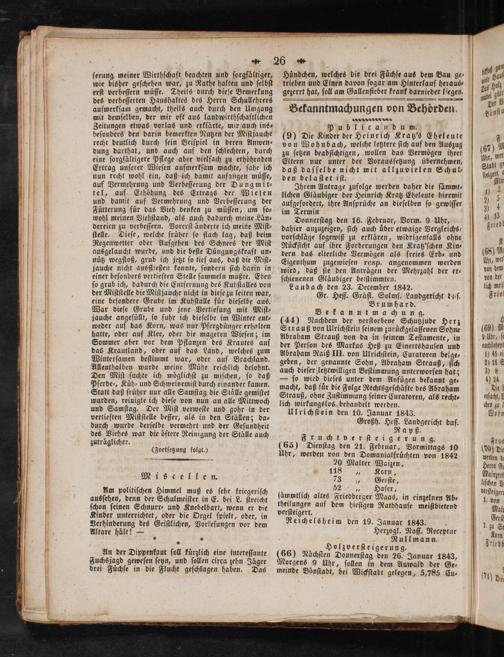Laubach den 23. December 1842. Gr. Heſſ. Gräfl. Solmſ. Landgericht daſ. Brumhard. Bekanntmachung. (44) Nachdem der verſtorbene Schutzjude Herz Strauß von Ulrichſtein ſeinem zurückgelaſſenen Sohne Abraham Strauß von da in ſeinem Teſtamente, in der Perſon des Markus Heß zu Einertshauſen und Abraham Raiß III. von Ulrichſtein, Curatoren bei ge⸗ geben, der genannte Sohn, Abraham Strauß, ſich auch dieſer letztwilligen Beſtimmung unterworfen hat; — ſo wird dieſes unter dem Anfügen bekannt ge⸗ macht, daß fuͤr die Folge Rechtsgeſchäfte des Abraham Strauß, ohne Zuſtimmung ſeiner Curatoren, als recht⸗ lich wirkungslos behandelt werden. Ulrichſtein den 10. Januar 1843. Großh. Heſſ. Landgericht daſ. Rayß. 8 Fruchtverſtei gerung. (65) Dienſtag den 21. Februar, Vormittags 10 Uhr, werden von den Domanialfrüchten von 1842 20 Malter Waizen, 118 Kon; 73„ Geerſte, 5 52 5 Hafer, ſämmtlich altes Friedberger Maas, in einzelnen Ab⸗ theilungen auf dem hieſigen Rathhauſe meiſtbietend verſteigert. Reichelsheim den 19. Januar 1843. Herzogl. Naſſ. Receptur 925 8 5 Rullmann. 2 6 olzverſteigerung. (66) Nächſten Donnerſtag 8 200 Januar 1843, Morgens 9 Uhr, ſollen in dem Auwald der Ge⸗ meinde Bönſtadt, bei Wickſtadt gelegen, 5,785 Cu⸗