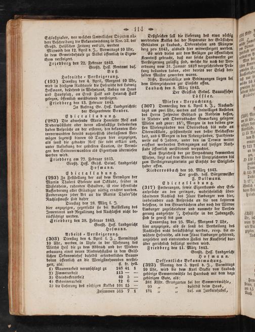Edictalla dung. (293) Zu Feſtſtellung der auf dem Vermögen der Martin Thalers Eheleute aus Ockſtadt, früher in Wiſſelsheim, ruhenden Schulden, iſt eine öffentliche Aufforderung aller Gläubiger nöthig erachtet worden. Forderungen jeder Art an die Martin Thaler'ſche Nachlaßmaſſe ſind daher Dienſtag den 28. März l. J. hier anzuzeigen, gegenfalls ſie bei Aufſtellung des Inventares und Regulirung des Nachlaſſes nicht be⸗ rückſichtigt werden. Friedberg den 28. Februar 1843. Großh. Heſſ. Landgericht Hofmann. Arbeits-Verſteigerung. (303) Dienſtag den 4. April l. J., Vormittags 10 Uhr, werden in Utphe in der Wohnung des Wirths Heil die zu dem Abbruch und der Wieder⸗ erbauung eines neuen Rindviehſtalles in dem Gräf⸗ lichen Oekonomiehof daſelbſt erforderlichen Bauar⸗ beiten öffentlich an die Wenigſtnehmenden verſtei⸗ gert, als: fl. kr. hell. 1) Maurerarbeit voranſchlagt zu 248 41 1 Zimmerarbeit 11 3) Steindeckerarbeit 40 5 4) Schreinerarbeit 12 6 5) die Lieferung des noͤthigen Kalkes 101 15