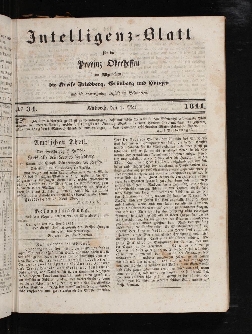 Friedberg am 27. April 1844. Heute Morgen fand in inſern Mauern eine Feſtlichkeit Statt, wie nicht allein wir ſie joch nicht geſehen haben, ſondern wie ſie überhaupt ohne frü⸗ leres Beiſpiel iſt. Es wurden nemlich in der hieſigen Synagoge zwei taubſtumme Geſchwiſter, Johanna und Meier Leopold von Gettenau, konfirmirt. Seide waren, das Mädchen ſeit 6, der Knabe ſeit 5 Jahren nder hieſigen Taubſtummenanſtalt und hatten zuerſt mit nen chriſtlichen Schülern zugleich den vorbereitenden, dann on Herrn Lehrer Cahn, der ſich mit vieler Bereitwillig— eit dem Auftrage unterzog, den confeſſionellen Religionsunter— icht empfangen und gerne entſprach der Großh. Rabbine,