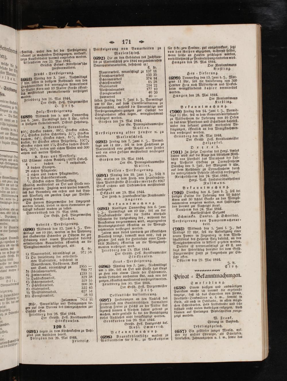 für 8 kr. pro Centner, gut ausgetrocknet, fetzt von den Reihen abgegeben, während ſpaͤter, wenn ſolche an Haufen geſchlagen worden, verhältnißmäßlge Preiserhöhung eintreten wird. Hungen den 28. Mai 1844. Der Rentamtmann Kießling. Heu Lieferung. (699) Donnerſtag den 13. Juni d. J., Mor⸗ gens 11 Ubr, ſoll die Anlieferung von 300 Centner Heu nach Wölfersheim und Weckes⸗ heim wenigſtfordernd dahier veraccordirt werden. Hungen den 28. Mai 1844. Der Rentamtmann Kießling. Bekanntmachung. (700) Freitag den 14. Juni l. J., Vormit⸗ tags 11 Ubr, ſoll in dem Gemeindewirthsbauſe zu Wölfersheim die Lieferung von 10 Oefen in das neue Pfarrhaus und Schulhaus daſelbſt, unter den bekannt gemacht werdenden Be⸗ dingungen, öffentlich an den Wenigſtnehmen⸗ den verſteigert werden. Grünberg den 28. Mai 1844. Der Großh Heſſ. Kreisbaumeiſter Holzapfel. Nini. (1000 Zu Folge Decretur des Herzl. Amtes dahier wird auf die Klage des Abraham Roth⸗ ſchild von Florſtadt das Wohnhaus der Lud⸗ wig Weſſerlis Chefrau zu Dornaſſenheim Dienſtag den 9. Juli, des Morgens 9 Uhr, auf dem Rathhauſe zu Dornaſſenheim durch die unterzeichnete Behörde öffentlich verſteigert. Reichelsheim den 24. Mai 18444. Herzl. Naſſ. Landoberſchultheiſerei Rullmann. Bekanntmachung (702) Dienſtag den 4. Juni d. J. ſoll bei bieſiger Saline die Lieferung von 69 Achtel Korn und 30 Achtel Gerſte an den Wenigſt⸗ nebmenden vergeben werden, was Luſttragen⸗ den hiermit zur Nachricht dient. Naubeim den 24. Mai 1844. Kurfürſtliches Salzamt Schmincke. Dunker. F. Schreiber. Verſteigerung von Pumpenmacherar⸗