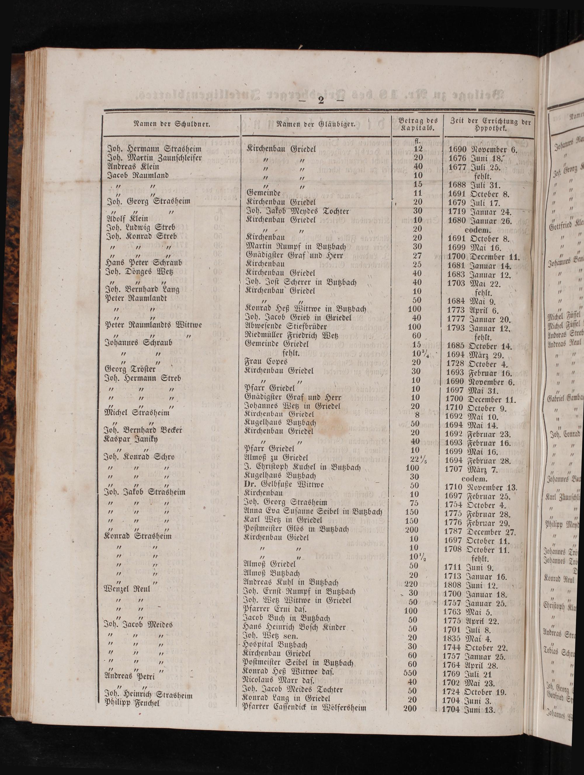 W 7 1005 2 Andreas Kuhl in Butzbach 220 1808 3 5 enzel Reul Joh. Ernſt Rumpf in Butzbach 30 1700 ee 2 7 Joh. Wetz Wittwe in Griedel 5 50 17 3 15 2 Hr Pfarrer Erni daſ. 100 1 5 3