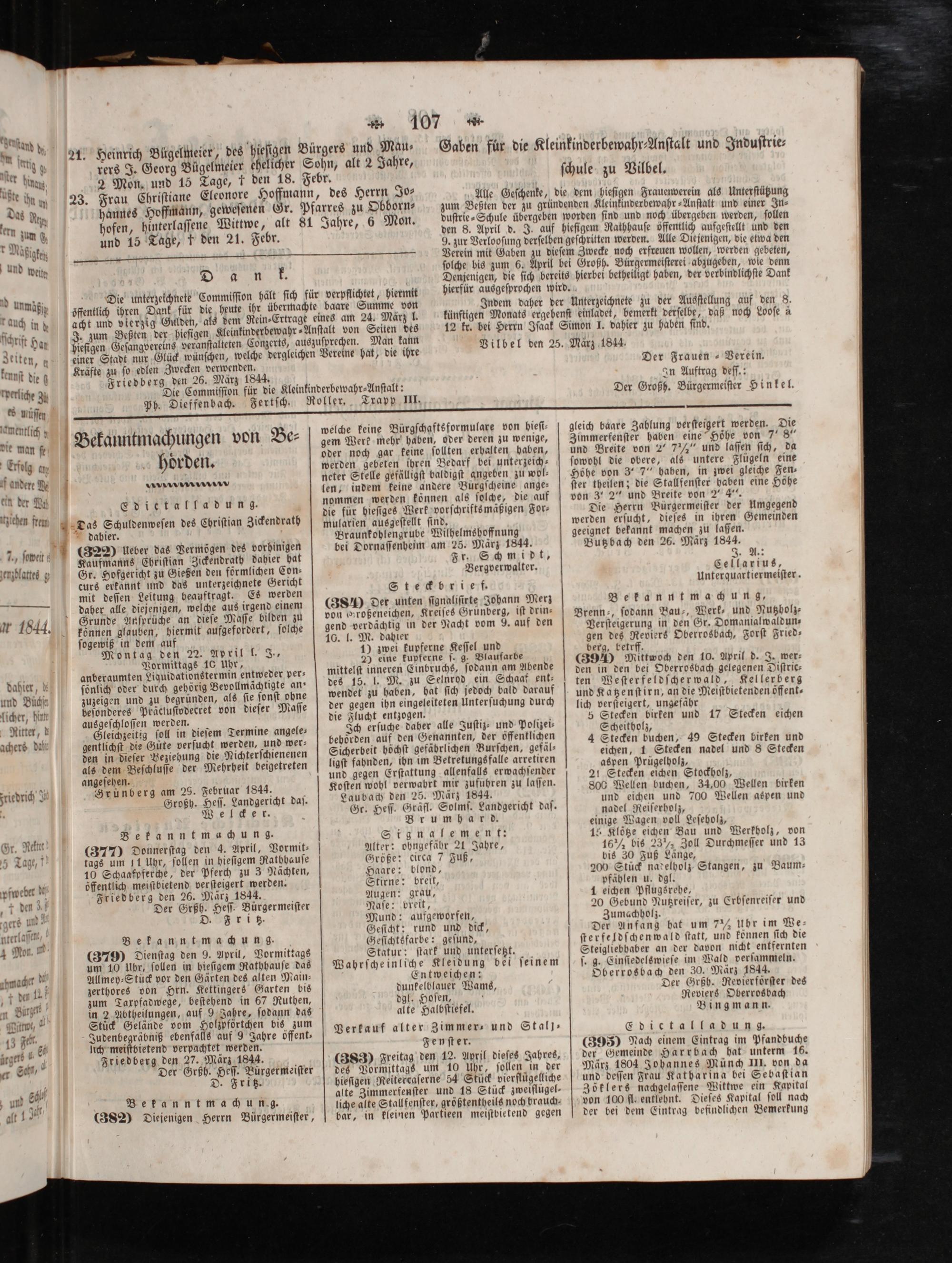 Vilbel den 25. März 1844. Der Frauen- Verein. In Auftrag deſſ.: