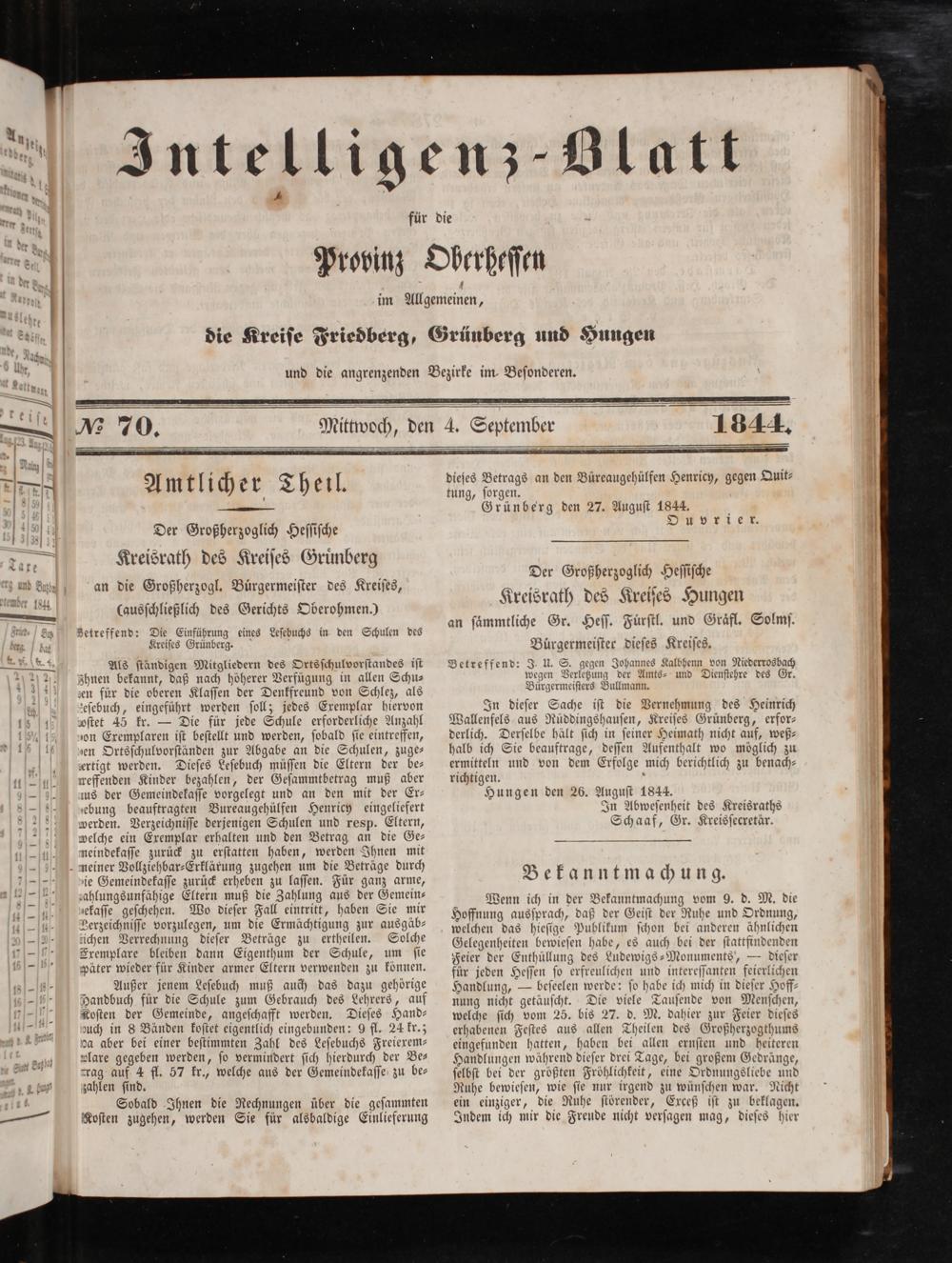 dieſes Betrags an den Buͤreaugehülfen Henricy, gegen Quit⸗ tung, ſorgen. Grünberg den 27. Auguſt 1844. orie