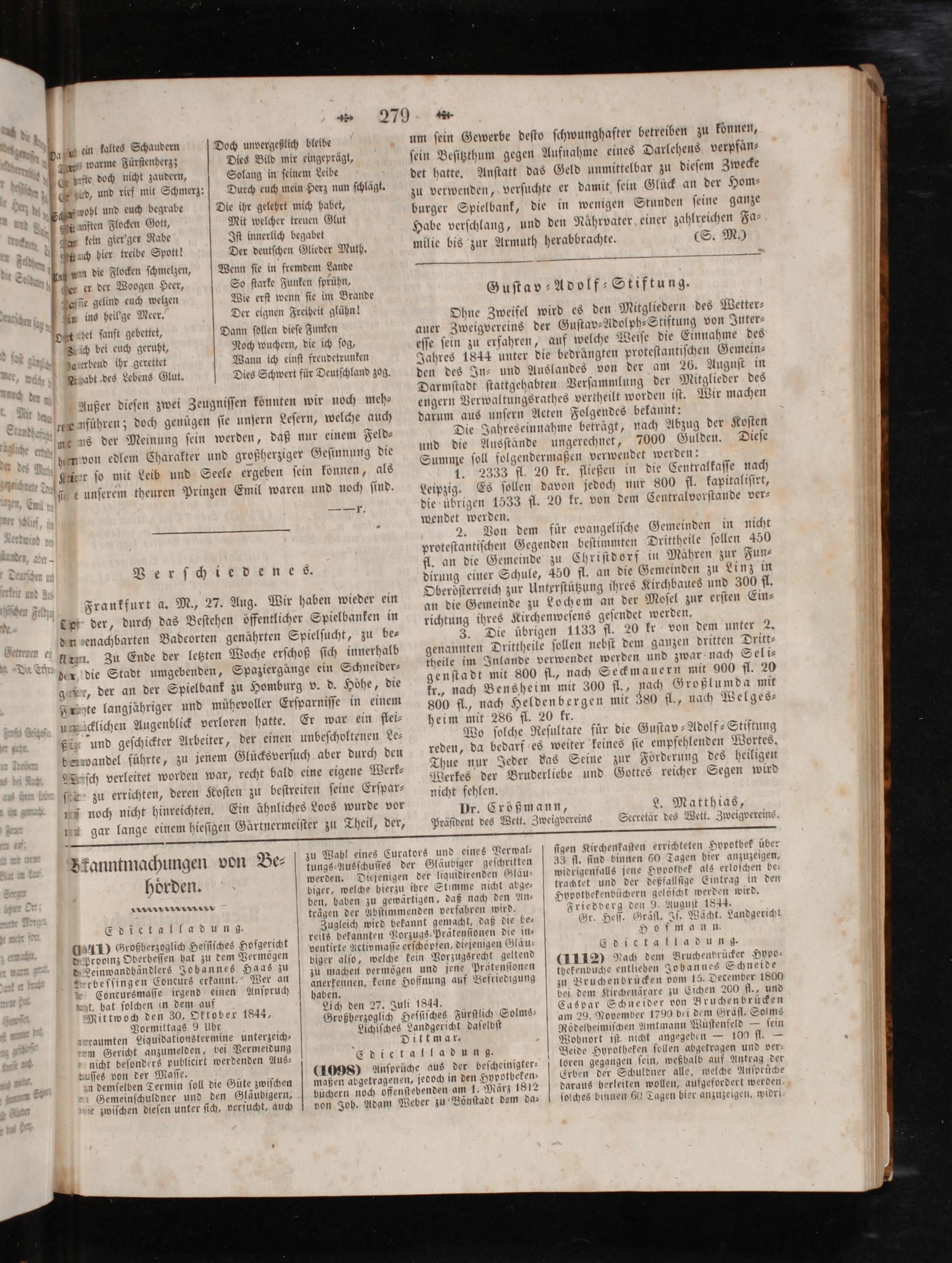 Ohne Zweifel wird es den Mitgliedern des Wetter— auer Zweigvereins der Guſtav-Adolph⸗Stiftung von Inter⸗ eſſe ſein zu erfahren, auf welche Weiſe die Einnahme des Jahres 1844 unter die bedrängten proteſtantiſchen Gemein- den des In- und Auslandes von der am 26. Auguſt in Darmſtadt ſtattgehabten Verſammlung der Mitglieder des engern Verwaltungsrathes vertheilt worden iſt. Wir machen darum aus unſern Acten Folgendes bekannt: