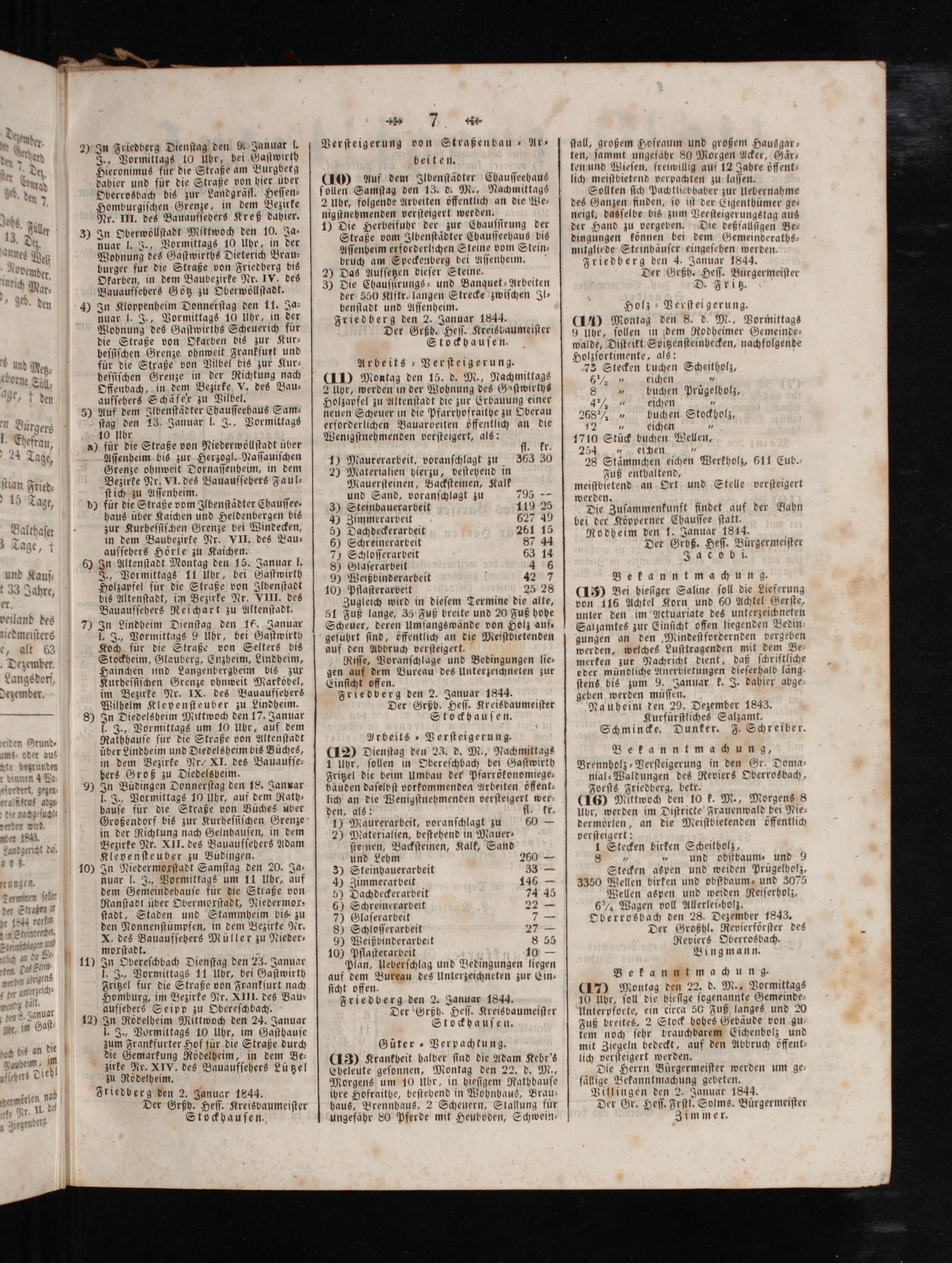7) In Lindbeim Dienſtag den 16. Januar I. J., Vormittags 9 Uhr, bei Gaſtwirth Koch für die Straße von Selters bis Stockheim, Glauberg, Enzheim, Lindheim, Hainchen und Langenbergheim bis zur Kurheſſiſchen Grenze ohnweit Marköbel, im Bezirke Nr. IX. des Bauaufſebers Wilhelm Kleyenſteuber zu Lindheim.