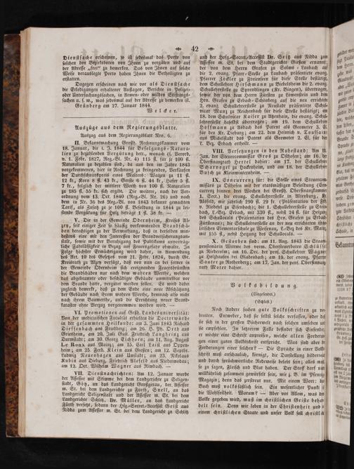 VIII. Verſetzungen in den Ruheſtand: Am 10. Jan. der Steuercommiſſaͤr Gros zu Oſthofen; am 16. der Oberfinanzrath Hertel dahier: am 17. der Schullehrer Scharvogel zu Hackenheim, und am 18. der Schullehrer Buſch zu Kleinwinternheim.—