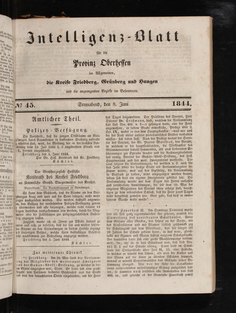 om Bäume an den Vicinalwegen in dieſem Herbſte ergänzt ud diejenigen Beſitzer, welche ihren deßfallſigen Befehlen ncht nachkommen zur Beſtrafung angezeigt werden. Friedberg den 5. Juni 1844. Küchler.