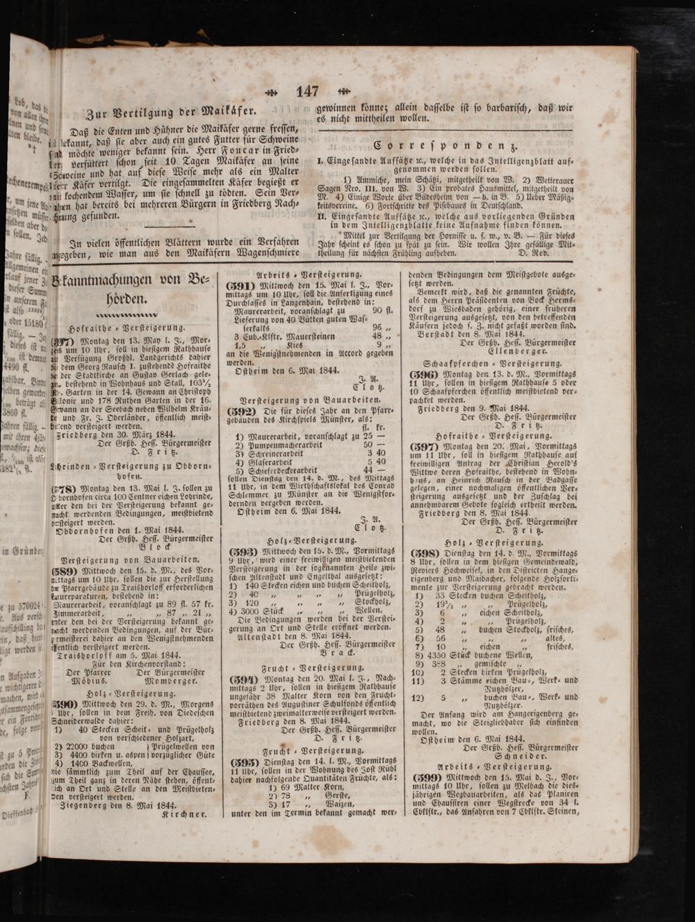 ene gl, f 1 9 11 i 1.. 6. elle Aus hen hat bereits bei mehreren Bürgern in Friedberg Nach—⸗ keitsvereine. 6) Fortſchritte des Piſebaues in Deutſchland. muſſe rung gefunden. II. Eingeſandte Aufſfätze ꝛc., welche aus vorliegenden Gründen er do in dem Intelligenzblatte keine Aufnahme finden können. den. Jed 0 5 5 1 75 0 Mittel zur Vertilgung der Horniſſe u. ſ. w., v. B.— Für dieſes In vielen öffentlichen Blattern wurde ein Verfahren Jahr ſcheint es ſchon zu ſpat zu ſein. Wir wollen Ihre gefällige Mit⸗ dig. megeben, wie man aus den Maikäfern Wagenſchmiere theilung für nächſten Frühling aufheben. D. Red. einen ei ‚ jener 9 E 5 Be⸗ Arbeits-Verſteigerung. denden Bedingungen dem Meiſtgebote ausge— ener 35 gen von Be⸗ 5 1. ſeht W 8 Hkanntmachungen von Be⸗(39) Mitwoch den 18. Mei l. 3, Bor, ſezt werden. — hoͤrden mittags um 10 Uhr, ſoll die Anfertigung eines Bemerkt wird, daß die genannten Früchte, cem g. 0* Durchlaſſes in Langenhain, beſtehend in: als dem Herrn Präſidenten von Bock Herms⸗ 1 ,] Maurerarbeit, voranſchlagt zu K 90 fl. dorf zu Wiesbaden gehörig, einer früheren 15180 i d Lieferung von 40 Buͤtten guten Waſ⸗ Verſteigerung ausgeſetzt, von den betreffenden 5 Hofraithe-Verſteigerung. ſerkalks 96„ Käufern jedoch ſ. Z. nicht gefaßt worden ſind. diese 877) Montag den 13. May l. J., Mor⸗ 3 Cub. Klftr. Mauerſteinen 40 1 Berſtadt 8. 1 5 92 85. item zers um 10 Uhr, ſoll in hieſigem Rathhauſe 1.5,„ Kies 8 9 75 e le eee dem zu Verfugung Großhl. Landgerichts dahier an die Wenigſtnehmenden in Accord gegeben Ellenberger. 1490 fl di dem Georg Rauſch J. zuſtehende Hofraithe ann 2 5 4 Schaafpferchen-Verſteigerung. r me, bel der Stadtkirche an Guſtav Gerlach gele⸗ Oſtheim den 6. Mal 1844. 8(396) Montag den 13. d. M., Vormittags . Ilan ge, beſtehend in Wohnhaus und Stall, 103 G A. 11 Uhr, follen in hieſigem Rathhauſe 5 oder geworden Rö. Garten in der 14. Gewann an Chriſtoph 8 9. 10 Schaafpferchen öffentlich meiſtbietend ver— Blonir und 178 Ruthen Garten in der 16. Verſteigerung von Bauarbeiten. pachtet werden. N Grvann an der Seebach neben Wilhelm Kräu—(392) Die für dieſes Jahr an den Pfarr⸗ Friedberg den 9. Mai 1844. te und Fr. J. Oberländer, öffentlich meiſt-] gebauden des Kirchſpiels Münſter, als: Der Grßh. Heſſ. Bürgermeiſter 9.— birend verſteigert werden. fl. kr D. Fritz. Friedberg den 30. März 1844. N i ranſ 18— frai ede r 40 5 Der Grßh Hes Bürgermeiſter 1) Maurerarbeit, voranſchlagt zu 25— Hofraithe-Verſteigerung. 1 D.. 21 0 0 0 5—— 0 5 0 i i J d 5 2) Pumpenmacherarbeit 50(597) Montag den 20. Mai, Vormittags 00 N 164 8 5. 3 eee 3 15 um 11 uhr, ſoll in hieſigem Rathhauſe auf I. N Lhrinden-Verſteigerung zu Obborn— 8 Sen 44 4⁰ freiwilligen Antrag der Chriſtian Herold's 5 5) Schiefer— Wittwe deren Hofraithe, beſtehend in Wohn— hofen. ſollen Dienſtag den 14. d. M., des Mittags 1 e ee eee 678) Montag den 13. Mai l. J. ſollen zu] 11 uhr, in dem Wirthſchaftslokal des Conrad gelegen, einer nochmaligen offentlichen Ver⸗ O bornbofen circa 100 Centner eichen Lohrinde, Schlemmer zu Münſter an die Wenigſtfor— ſteigerung ausgeſetzt und der Zuſchlag bei utter den bei der Verſteigerung bekannt ge⸗ dernden vergeben Mapeß, 6 annehmbarem Gebote ſogleich ertheilt werden. nucht werdenden Bedingungen, meiſtbietend Oſtheim den 6. Mai 1844. Friedberg den 8. Mai 1844 heſteigert werden. J. A. Der Grßh. Heſſ. Bü f Obbornhofen den 1. Mai 1844. Clotz. e eee ee Der Grßh. Heſſ. Bürgermeiſter 8 i. * Bo ck Holz Verſteiger ung.. Holz- Verſteigerung. run(393) Mittwoch den 15. d. M., Vormittags