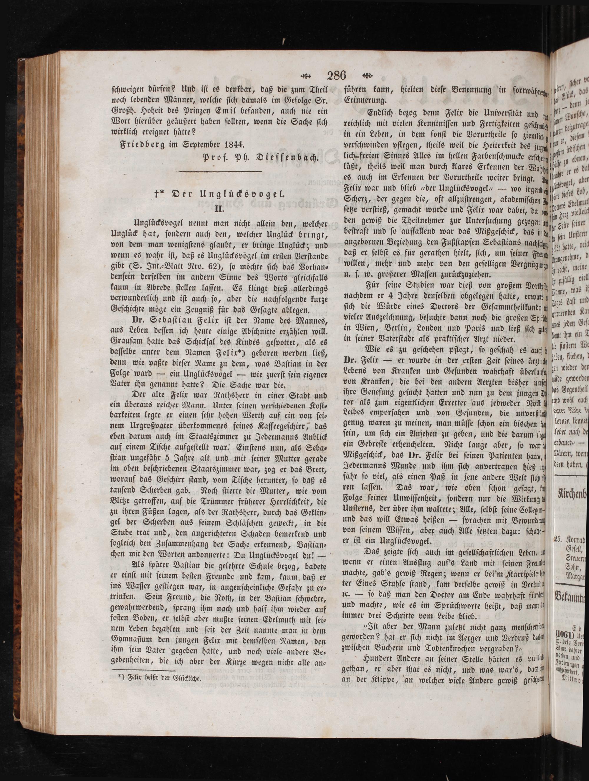 Dr. Sebaſtian Felix iſt der Name des Mannes, aus Leben deſſen ich heute einige Abſchnitte erzählen will. Grauſam hatte das Schickſal des Kindes geſpottet, als es daſſelbe unter dem Namen Felix“) geboren werden ließ, denn wie paßte dieſer Name zu dem, was Baſtian in der Folge ward— ein Unglücksvogel— wie zuerſt ſein eigener Vater ihn genannt hatte? Die Sache war die.