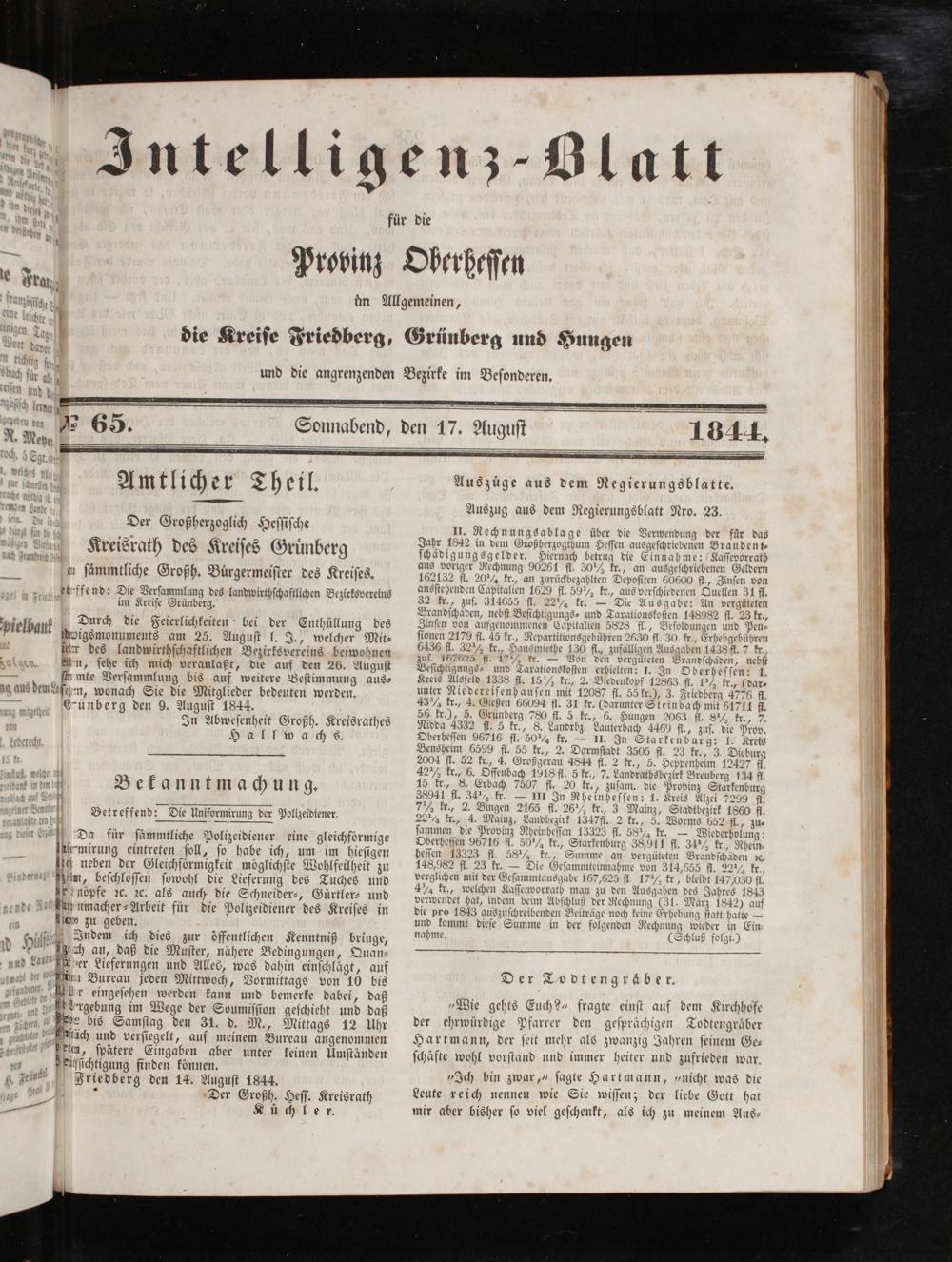 85 Der Großherzoglich Heſſiſche e Kreisrath des Kreiſes Gruͤnberg en ſaͤmmtliche Großh. Buͤrgermeiſter des Kreiſes.