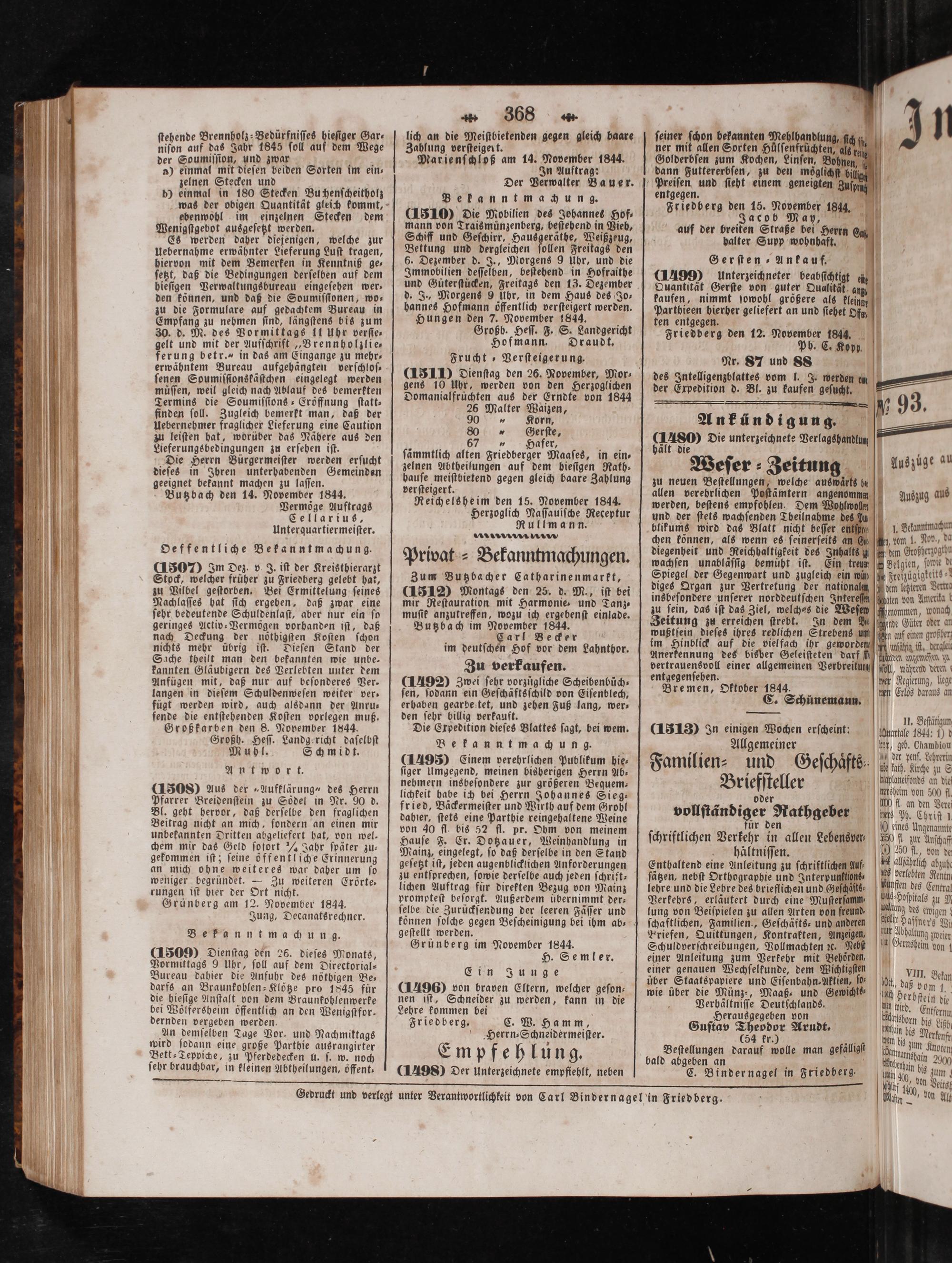 ten entgegen. Friedberg den 12. November 1844. Ph. C. Kopp. Nr. 87 und 88 des Intelligenzblattes vom l. J. werden un der Expedition d. Bl. zu kaufen geſucht.