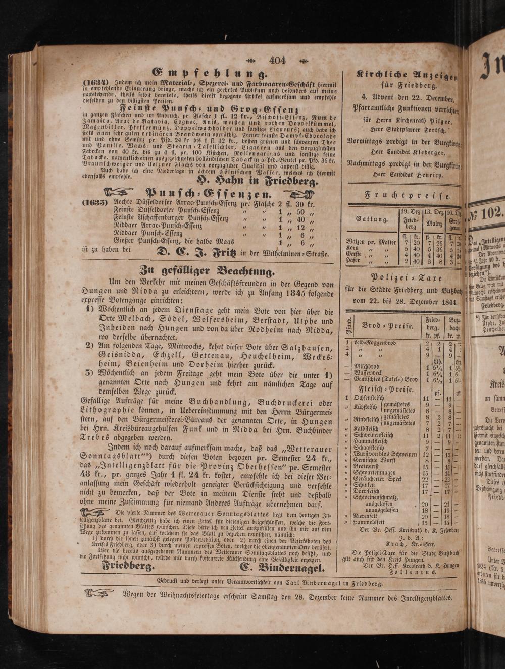 expreſſe Botengange einrichten: vom 22. bis 28. Dezember 1844. 0 Friedberg. 1) Wöchentlich an jedem Dienſtage geht mein Bote von hier über die 8 5 Ti denke Orte Melbach, Södel, Wölfersheim, Berſtadt, Utphe und Brod ⸗Preiſe libre 95 dose dn Inheiden nach Hungen und von da über Rodheim nach Nidda, 8 br. 1 tr. ff. wo derſelbe übernachtet. 5 II Lelb⸗Roggenbrod e 2) Am folgenden Tage, Mittwochs, kehrt dieſer Bote über Salzhauſen, 4 1 7 9 1 9 0 N Geisnidda, Echzell, Gettenau, Heuchelheim, Weckes— 1 50 h. 9 heim, Beienheim und Dorheim hierher zurück. 8 2 1 116% 1052 a 5) Wöchentlich an jedem Freitage geht mein Bote über die unter 1)— Genes(rafel) Brod 1 5 106 Kreis genannten Orte nach Hungen und kehrt am nämlichen Tage auf Fleiſch⸗Preiſe. 1 kels demſelben Wege zurück. i 1 Ochſenfleiſh 11— 2 an ſämn Gefällige Aufträge für meine Buchhandlung, Buchdruckerei oder„ Kühſteiſch gemäſtetes 9— 8 vetref Lithographie können, in Uebereinſtimmung mit den Herrn Bürgermei⸗ e genes 1 8 5 ſtern, auf den Bürgermeiſterei-Büreaus der genannten Orte, in Hungen“ Sana ee 8 2 ulrsnaht i N 2 9 ö; s i. albflei 217— r bei Hrn. Kreisbüreaugehülfen Funk und in Nidda bei Hrn. Buchbinder, Schleich eic 11 2% biernit enges Trebes abgegeben werden.„ Se. 9 9 genannten Kan 5 N 5 8 1 aafflei 7 le 2 Indem ich noch darauf aufmerkſam mache, daß das„Wetterauer„ Wurſtbon bios Schweinen 12— ale 1 Sonntagsblatt“) durch dieſen Boten bezogen pr. Semeſter 24 kr.,„ Gemiſchte Wurſt 8— 8— zur chf das„Intelligenzblatt für die Provinz Sberheſſen“ pr. Semeſter 5 N 15. al ſucſihe 48 kr., pr. ganzes Jahr 1 fl. 24 kr. koſtet, empfehle ich bei dieſer Ver⸗„ Geräucherter Speck 22— 2 Dieses anlaſſung mein Geſchäft wiederholt geneigter Berückſichtigung und verfehle See 15* 15 5 Beſchenigung nicht zu bemerken, daß der Bote in meinem Dienſte ſteht und deßhalb, Schweinenſchmalz, 1 Friedb ohne meine Zuſtimmung für niemand Anderes Aufträge übernehmen darf. en ö 25 5 4 8 5 Die vierte Nummer des Wetterauer Sonntagsblattes liegt dem heutigen In⸗„Nierenfett 20% telligenzblatte bei. Gleichzeitig habe ich einen Zettel für diejenigen beigeſchloſſen, welche die Fort⸗„ Hammelsfett 15— 1⁵ 5 ſetzung des genannten Blattes wünſchen. Dieſe bitte ich den Zettel auszufüllen und ihn mir auf dem Der Gr. Heſſ. Kreisrath d. K. Friedberg Wege zukommen zu laſſen, auf welchem ſie das Blatt zu beziehen wünſchen, nämlich: JD. A.: 1) durch die ihnen zunächſt gelegene Poſterpedition, oder 2) durch einen der Bezirksboten des Krach, Kr.⸗Sctr. 5 Kreiſes Friedberg, oder 3) durch meinen expreſſen Boten, welcher die obengenannten Orte berührt. 5 1. 90 Betreff Wer die bereits ausgegebenen Nummern des Wetterauer Sonntagsblattes noch beſitzt, und„Die Polizei⸗Tare für die Stadt Butz bach 1 die Fortſetzung nicht wünſcht, würde mir durch koſtenfreie Rücksendung eine Gefälligkeit erzeigen. gilt auch für den Kreis Hungen. 6 uter N Friedberg. E. Bindernagel. e e eee ee 5 ö— Ableiten für d Gedruckt und verlegt unter Verantwortlichkeit von Carl Bindernagel in Friedberg. 05 nverzi, S Wegen der Weihnachtsfeiertage erſcheint Samſtag den 28. Dezember keine Nummer des Intelligenzblattes.