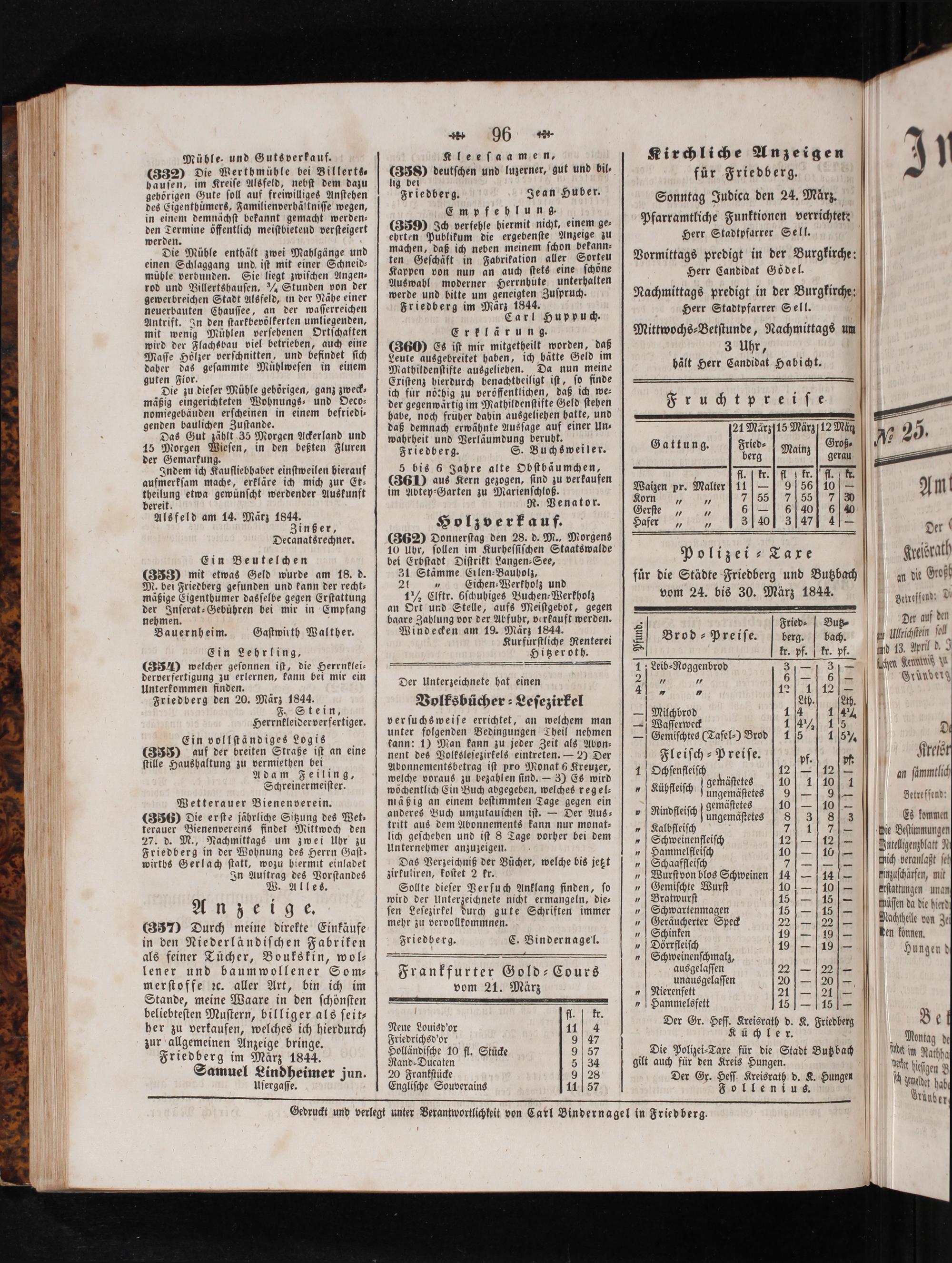 Polizei⸗Taxe fur die Städte Friedberg und Butzbach vom 24. bis 30. März 1844.