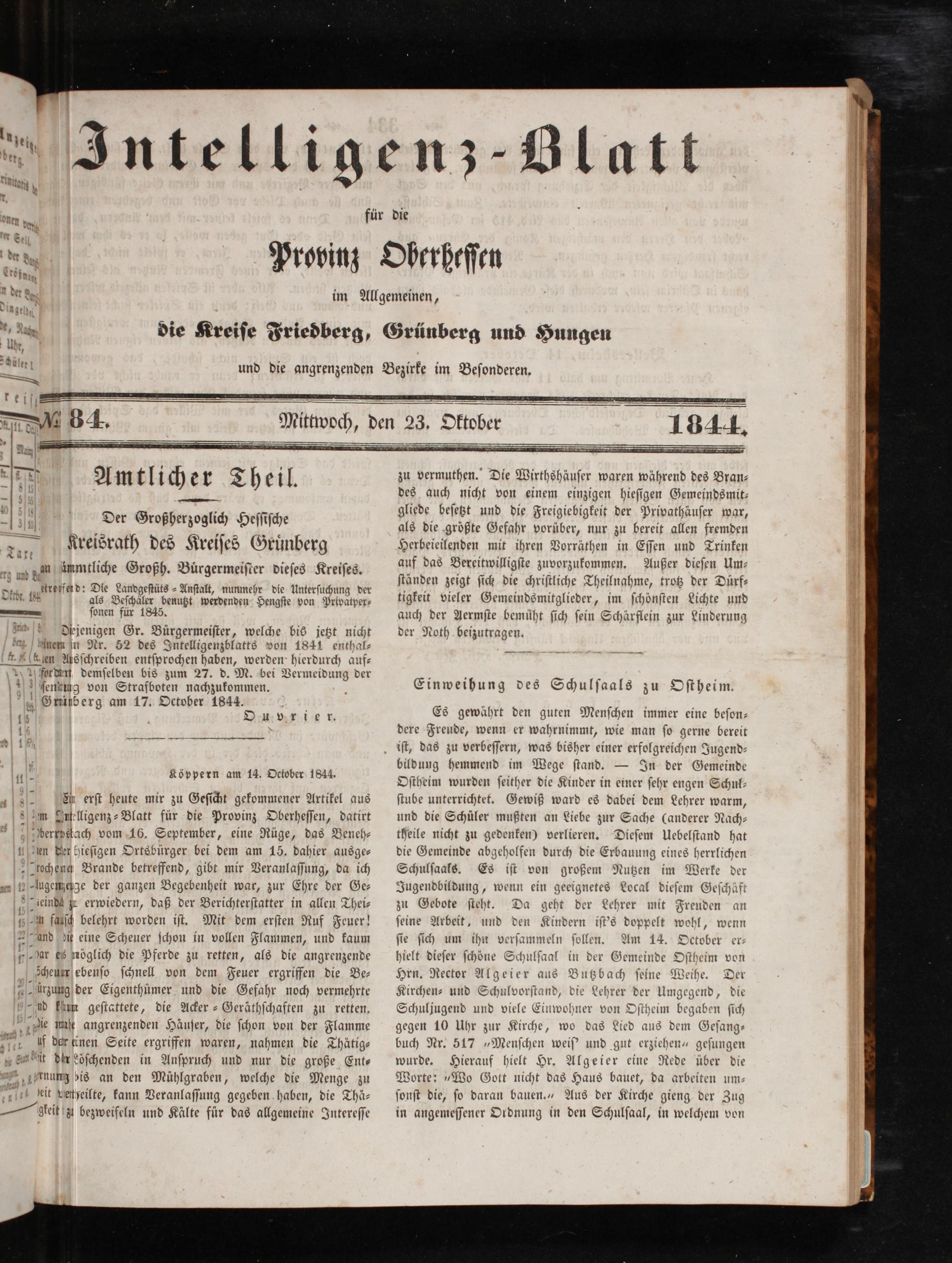 Es gewährt den guten Menſchen immer eine beſon— dere Freude, wenn er wahrnimmt, wie man ſo gerne bereit iſt, das zu verbeſſern, was bisher einer erfolgreichen Jugend— bildung hemmend im Wege ſtand.— In der Gemeinde Oſtheim wurden ſeither die Kinder in einer ſehr engen Schul— ſtube unterrichtet. Gewiß ward es dabei dem Lehrer warm, und die Schuler mußten an Liebe zur Sache(anderer Nach— theile nicht zu gedenken) verlieren. Dieſem Uebelſtand hat die Gemeinde abgeholfen durch die Erbauung eines herrlichen Schulſaals. Es iſt von großem Nutzen im Werke der Jugendbildung, wenn ein geeignetes Local dieſem Geſchäft zu Gebote ſteht. Da geht der Lehrer mit Freuden ſeine Arbeit, und den Kindern iſt's doppelt wohl, wenn ſie ſich um ihn verſammeln ſollen. Am 14. October er— hielt dieſer ſchöͤne Schulſaal in der Gemeinde Oſtheim von Hrn. Rector Algeier aus Butzbach ſeine Weihe. Der Kirchen⸗ und Schulvorſtand, die Lehrer der Umgegend, die Schuljugend und viele Einwohner von Oſtheim begaben ſich gegen 10 Uhr zur Kirche, wo das Lied aus dem Geſang— buch Nr. 517„Menſchen weiſ' und gut erziehen“ geſungen wurde. Hierauf hielt Hr. Algeier eine Rede über die Worte:„Wo Gott nicht das Haus bauet, da arbeiten um— ſonſt die, ſo daran bauen.“ Aus der Kirche gieng der Zug in angemeſſener Ordnung in den Schulſaal, in welchem von