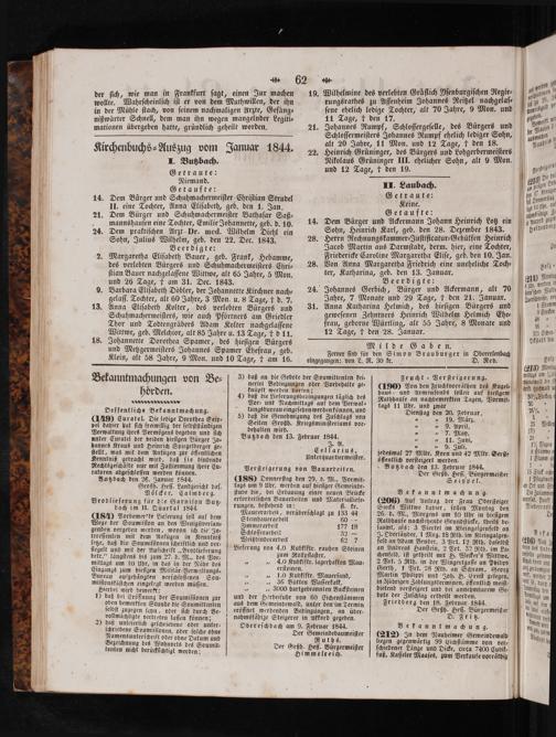 Getaufte: Dem Bürger und Schuhmachermeiſter Chriſtian Strudel II. eine Tochter, Anna Eliſabeth, geb. den 1. Jan. Dem Bürger und Schuhmachermeiſter Bathaſar Saß⸗ mannshauſen eine Tochter, Emilie Johannette, geb. d. 10. Dem praktiſchen Arzt Dr. med. Wilhelm Diehl ein Sohn, Julius Wilhelm, geb. den 22. Dec. 1843.