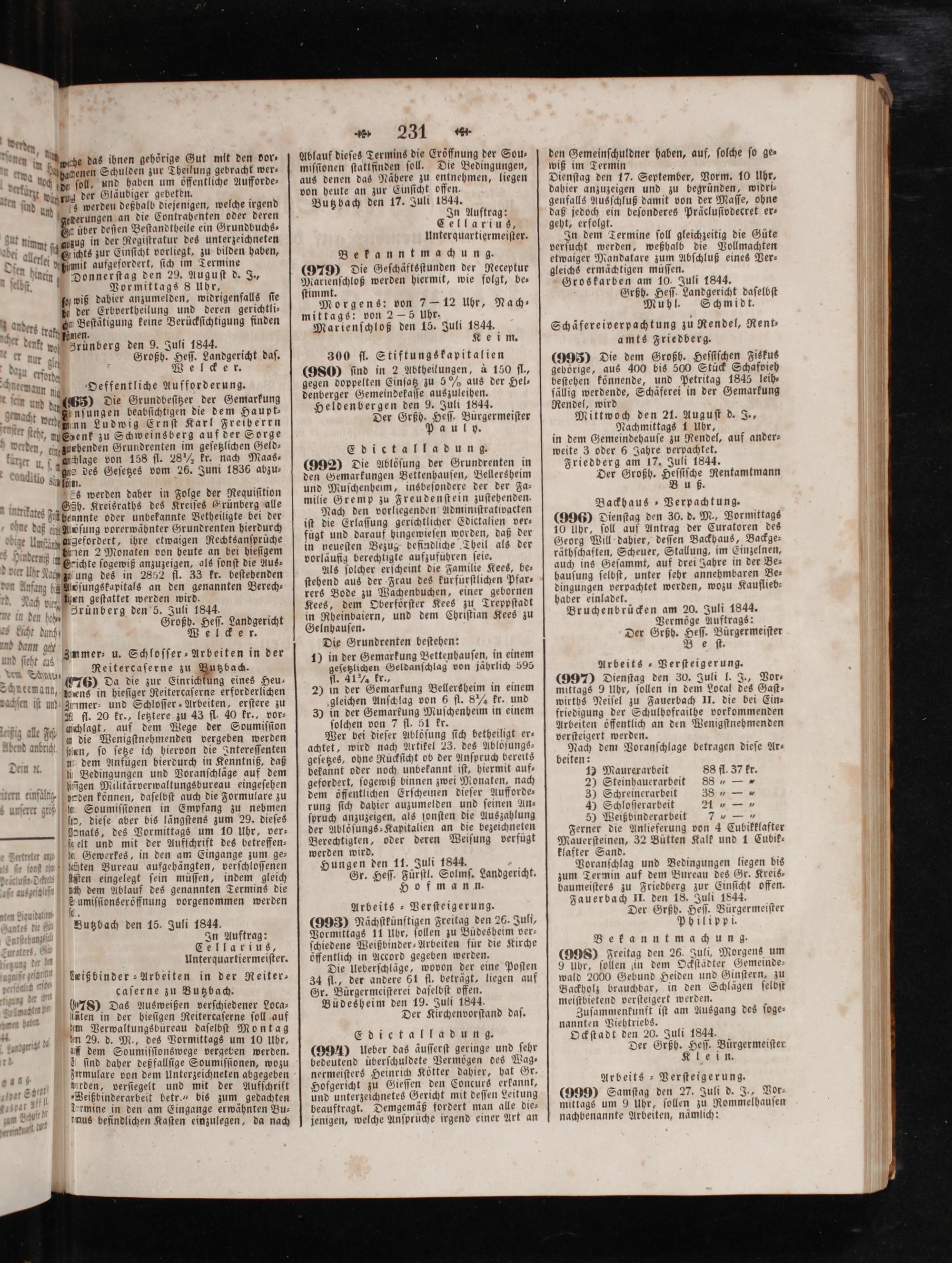 aus denen das Nähere zu entnehmen, liegen von heute an zur Einſicht offen. Butzbach den 17. Juli 1844.