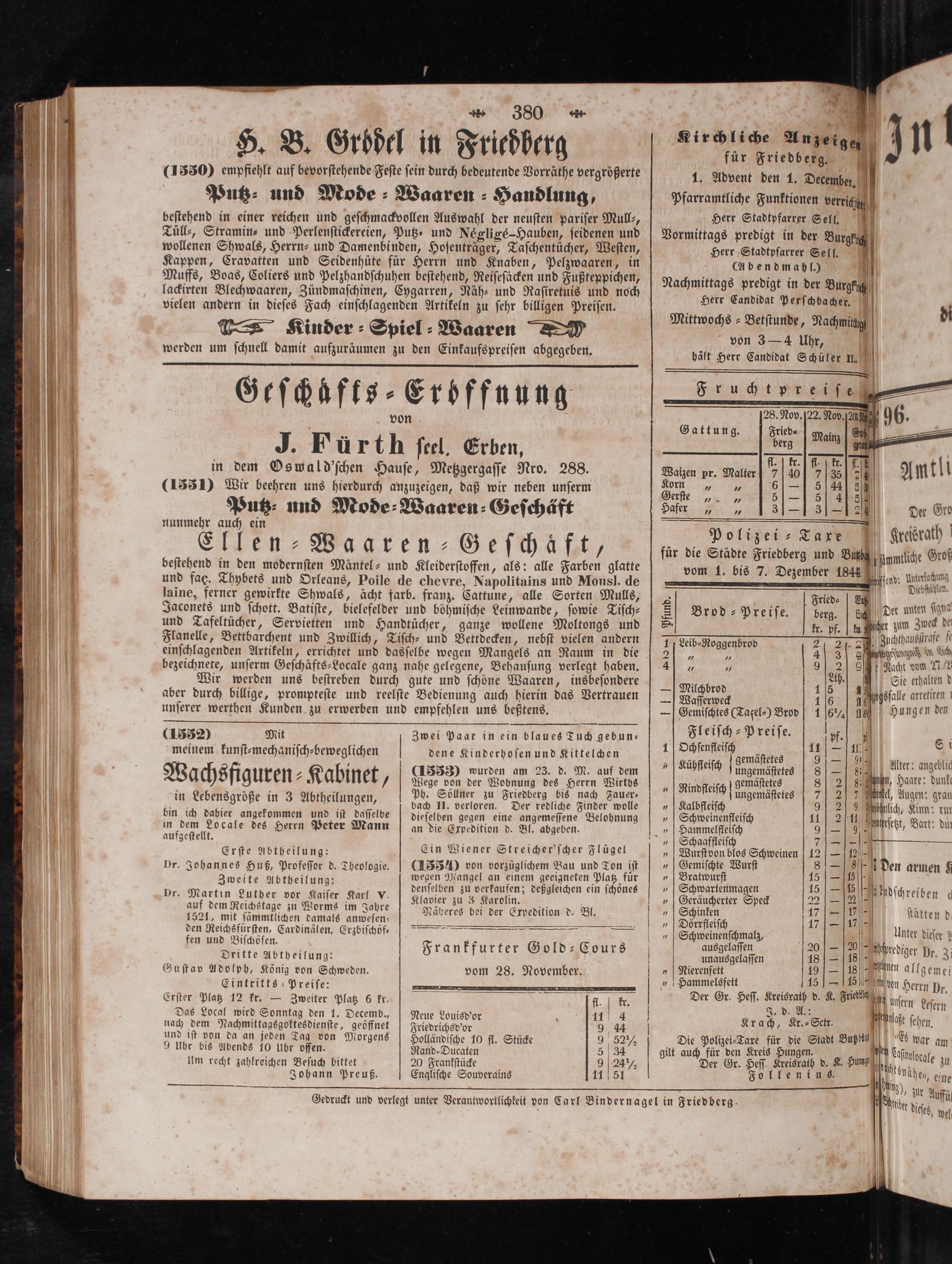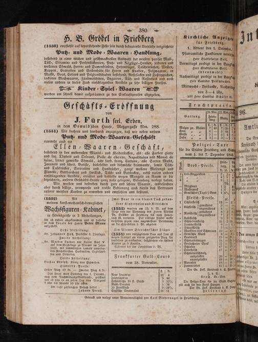 laine, ferner gewirkte Shwals, ächt farb. franz. Cattune, alle Sorten Mulls, 3 Fried⸗ Ag 14* Jaconets und ſchott. Batiſte, bielefelder und böhmiſche Leinwande, ſowie Tiſch— S Brod⸗Preiſe. berg. ei Der unten ana und Tafeltücher, Servietten und Handtücher, ganze wollene Moltongs und[8 kr. pf. h het zum Zweck de Flanelle, Bettbarchent und Zwillich, Tiſch⸗ und Bettdecken, nebſt vielen andern 1. Leib⸗Noggenbrod 2 2 uchthausſrafe“ einſchlagenden Artikeln, errichtet und dasſelbe wegen Mangels an Raum in die 2„ 75 4 3 All. Len bezeichnete, unſerm Geſchäfts-Locale ganz nahe gelegene, Behauſung verlegt haben. 44„ 7 9 2 g Nacht vom N Wir werden uns beſtreben durch gute und ſchöne Waaren, insbeſonderee Milchbrod f 75 11 Sie erhalten d aber durch billige, prompteſte und reelſte Bedienung auch hierin das Vertrauen— Waſſerweck 166 10 hefalle arretiren! unſerer werthen Kunden zu erwerben und empfehlen uns beßtens.—Gemiſchtes(Tafel⸗) Brod 16 ¼ U Hungen den (1532) Mit Zwei Paar in ein blaues Tuch gebun— Fleiſch⸗Preiſe. pf. 2 inem kunſt⸗mechaniſch⸗beweglick 1 0 ü 1 Ochſenfleiſch 11— 11 i meinem kunſt⸗mechaniſch⸗beweglichen dene Kinderhoſen und Kittelchen. ſgemaſere 9 e Laer angeble Wachsfi uren⸗ Kabinet(188) wurden am 23. d. M. auf dem“ Kühfteiſch Tungemäſtetes 8—% Aer: 1 0 9 15 7 Wege von der Wohnung des Herrn Wirths 5 Rindfleiſch 1 8 4 90 0 8 unke i 6 i a f Ph. Söllner zu Friedberg bis nach Fauer— e ungemäſtetes, 7 7 kel, Augen: grau N. 1% r 2 05 e, bach II. verloren. Der redliche Finder wolle„Kalbfleiſch 92 hnlich, Kinn: run bin ich dabier angekommen und iſt daſſelbe] dieſelben gegen eine angemeſſene Belohnung„ Schweinenfleiſch 111 20 ſrſetzt, Bart: dul in dem Locale des Herrn Peter Mann an die Expedition d. Bl. abgeben.„ Hammelfleiſch 9— 96. i aufgeſtellt.. F„. Schaaffleiſch 11. Erſte Abtheilung: Ein Wiener Streicher'ſcher Flügel„Wurſtvon blos Schweinen 12— 12 Dr. Johannes Huß, Profeſſor d. Theologie.](1854) von vorzüglichem Bau und Ton iſt„ Gemiſchte Wurſt 8 den armen Zweite Abtheilung: wegen Mangel an einem geeigneten Platz fuͤr[„ Bratwurſt 15— 5. Dr e denſelben zu verkaufen; deßgleichen ein ſchönes„Schwartenmagen 15— 15 hdſchreiben r. Martin Luther vor Kaiſer Karl V.; 9 Gerä Speck 22— 2 0 0 5 5 Klavier zu 3 Karolin.„ Geräucherter Spe 22 2 5 auß dem Reichstage zu Worms im Jahre Näheres bei der Expedition d. Bl„ Schinken 17 17 ſtätten d 1521, mit ſämmtlichen damals anweſen— 18 5 e„ Dorrfleiſch 17 17. 50 ee Cardinäſen, Erzbiſchöft f 5 5„ Schweinenſchmalz. Unter dieſer 2 en und Biſchöfen. l 8 0 5 f r urs ausgelaſſen 20— 20% beprediger r Dritte Abtheilung: 8 ankfurter Gold- Co unausgelaſſen 18— 18. 6 diger Dr. 1 Guſtav Adolph, König von Schweden. vom 28. November.„ Nierenfett 19— 18* When allgemei Eintritts Preiſe:— 8.„ Hammelsfett 141451. l Herrn Dr. Erſter Platz 12 kr.— Zweiter Platz 6 kr. fl. k. Der Gr. Heſſ. 1 d. K. Friebech i mern beſern Das Local wird Sonntag den 1. Decemb., Neue Louisd'or 5 11 4 J. d. A.: Ahſlaßt ser nach dem Nachmittagsgoktesdienſte, geöffnet Friedrichsd'or 944 Krach, Kr.⸗Sctr. ö t ſehen. und iſt von da an jeden Tag von Morgens Holländiſche 10 fl. Stücke 9 522 Die Polizei-Taxe für die Stadt Bußzhli„Ed war am 9 Uhr bis Abends 10 Uhr offen. Rand⸗Ducaten 5 34 gilt auch für den Kreis Hungen. U euſnolccale Um recht zahlreichen Beſuch bittet 20 Frankſtücke 9 2 Der Gr. Heſſ. Kreisrath d. K. Hun digte zu Johann Preuß. Engliſche Souverains 11151 Follenius, öuähen, eine