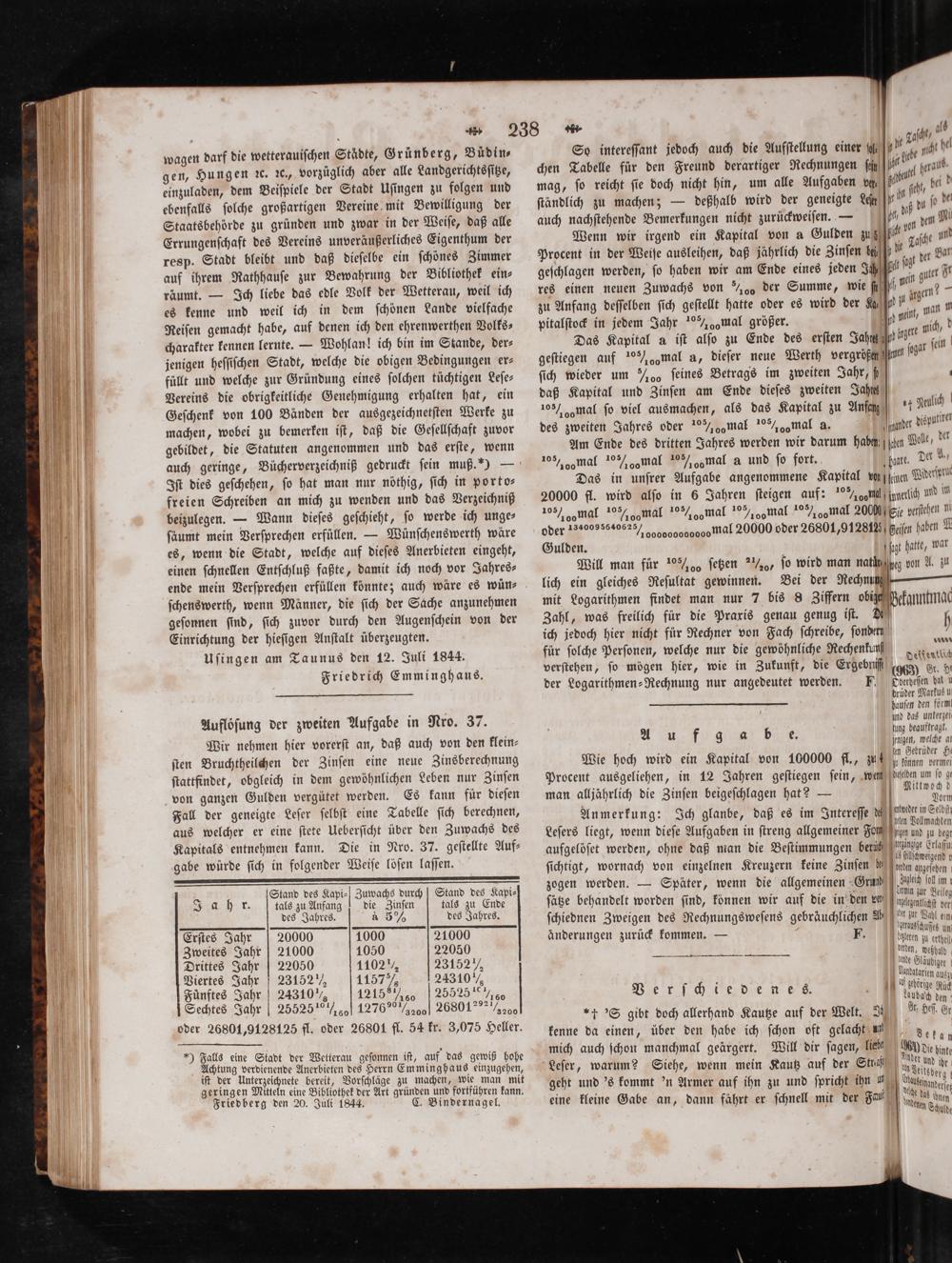 Wir nehmen hier vorerſt an, daß auch von den klein— ſten Bruchtheilchen der Zinſen eine neue Zinsberechnung ſtattfindet, obgleich in dem gewöhnlichen Leben nur Zinſen von ganzen Gulden vergütet werden. Es kann für dieſen Fall der geneigte Leſer ſelbſt eine Tabelle ſich berechnen, aus welcher er eine ſtete Ueberſicht über den Zuwachs des Kapitals entnehmen kann. Die in Nro. 37. geſtellte Auf⸗ gabe würde ſich in folgender Weiſe loͤſen laſſen.