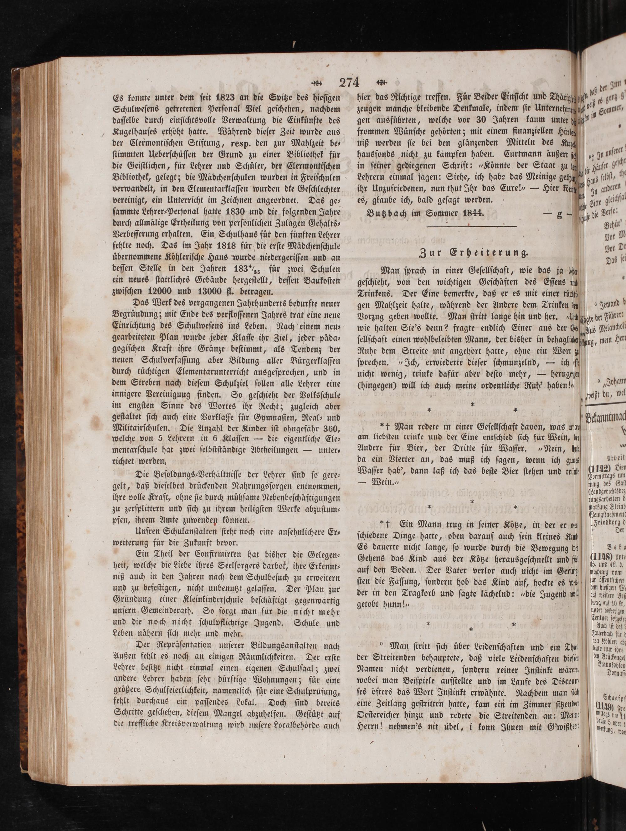 Ein Theil der Confirmirten hat bisher die Gelegen— heit, welche die Liebe ihres Seelſorgers darbot, ihre Erkennt— niß auch in den Jahren nach dem Schulbeſuch zu erweitern und zu befeſtigen, nicht unbenutzt gelaſſen. Der Plan zur Gründung einer Kleinkinderſchule beſchäftigt gegenwärtig unſern Gemeinderath. So ſorgt man für die nicht mehr und die noch nicht ſchulpflichtige Jugend. Schule und Leben nähern ſich mehr und mehr.