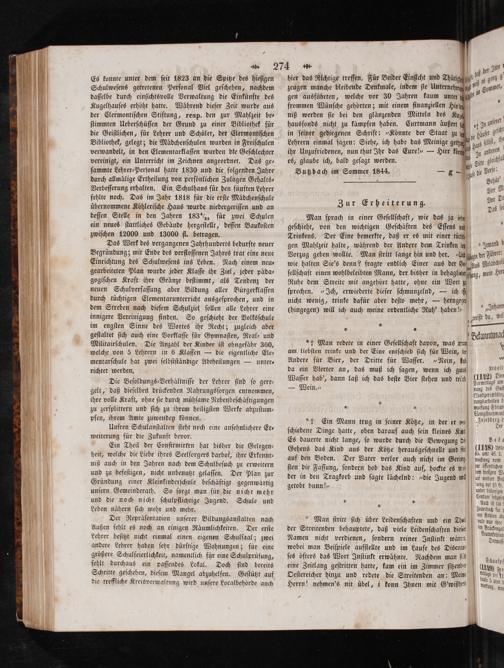 Das Werk des vergangenen Jahrhunderts bedurfte neuer Begründung; mit Ende des verfloſſenen Jahres trat eine neue Einrichtung des Schulweſens ins Leben. Nach einem neu⸗ gearbeiteten Plan wurde jeder Klaſſe ihr Ziel, jeder päda⸗ gogiſchen Kraft ihre Gränze beſtimmt, als Tendenz der neuen Schulverfaſſung aber Bildung aller Bürgerklaſſen durch tuͤchtigen Elementarunterricht ausgeſprochen, und in dem Streben nach dieſem Schulziel ſollen alle Lehrer eine innigere Vereinigung finden. So geſchieht der Volksſchule im engſten Sinne des Wortes ihr Recht; zugleich aber geſtaltet ſich auch eine Vorklaſſe für Gymnaſien, Real- und Militairſchulen. Die Anzahl der Kinder iſt ohngefähr 360, welche von 5 Lehrern in 6 Klaſſen— die eigentliche Ele— mentarſchule hat zwei ſelbſtſtändige Abtheilungen— unter⸗ richtet werden.