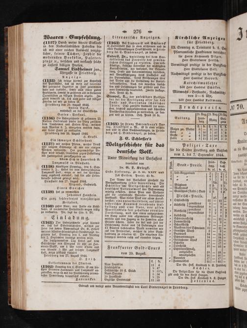 rare für die Städte Friedberg und Butzbeh vom 1. bis 7. September 1844.