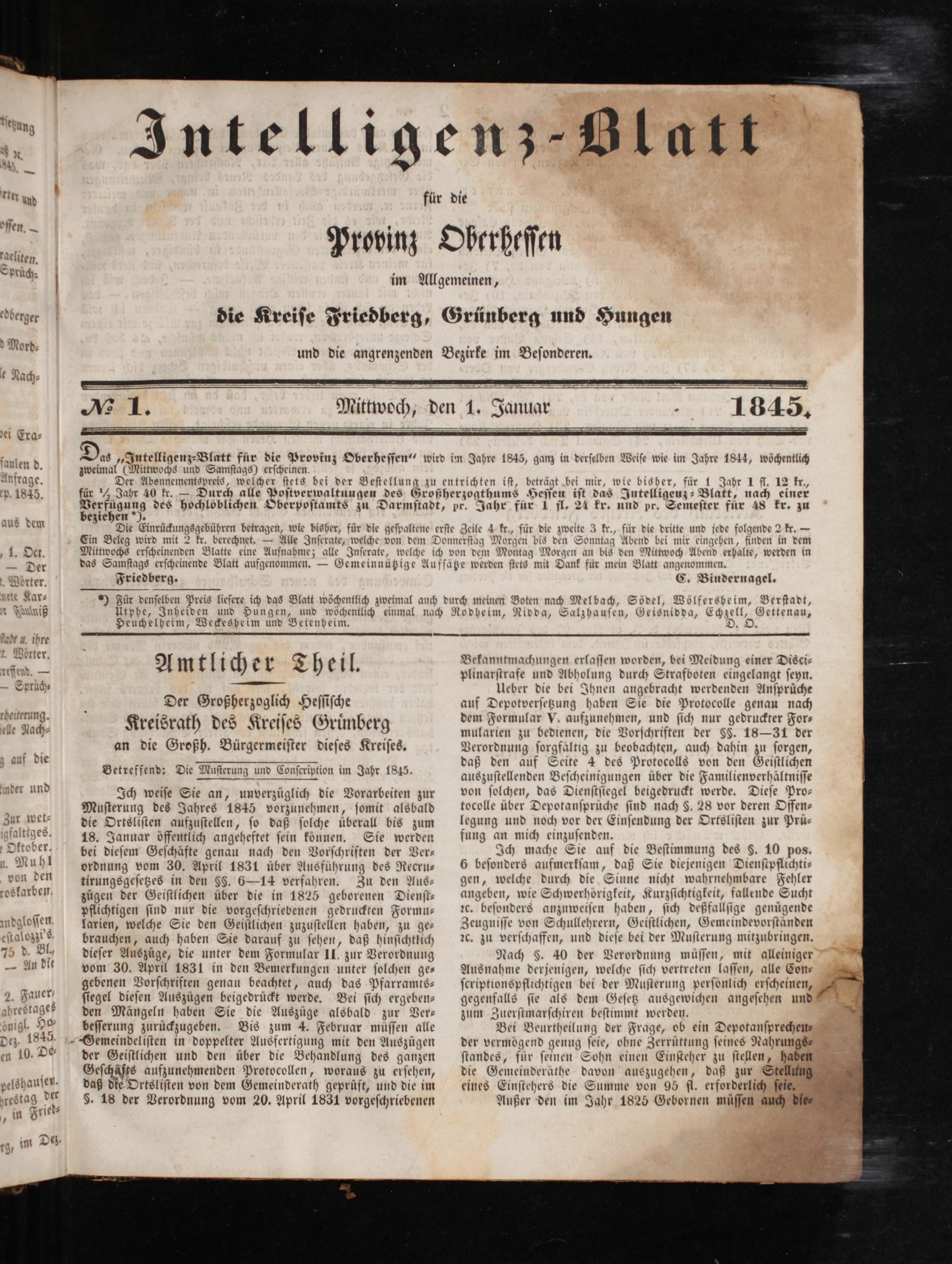 1 8.* 1 1 2 g a enn. D.„Jutelligenz⸗Blatt für die Provinz Oberheſſen“ wird im Jahre 1845, ganz in derſelben Weiſe wie im Jahre 1844, wöchentlich