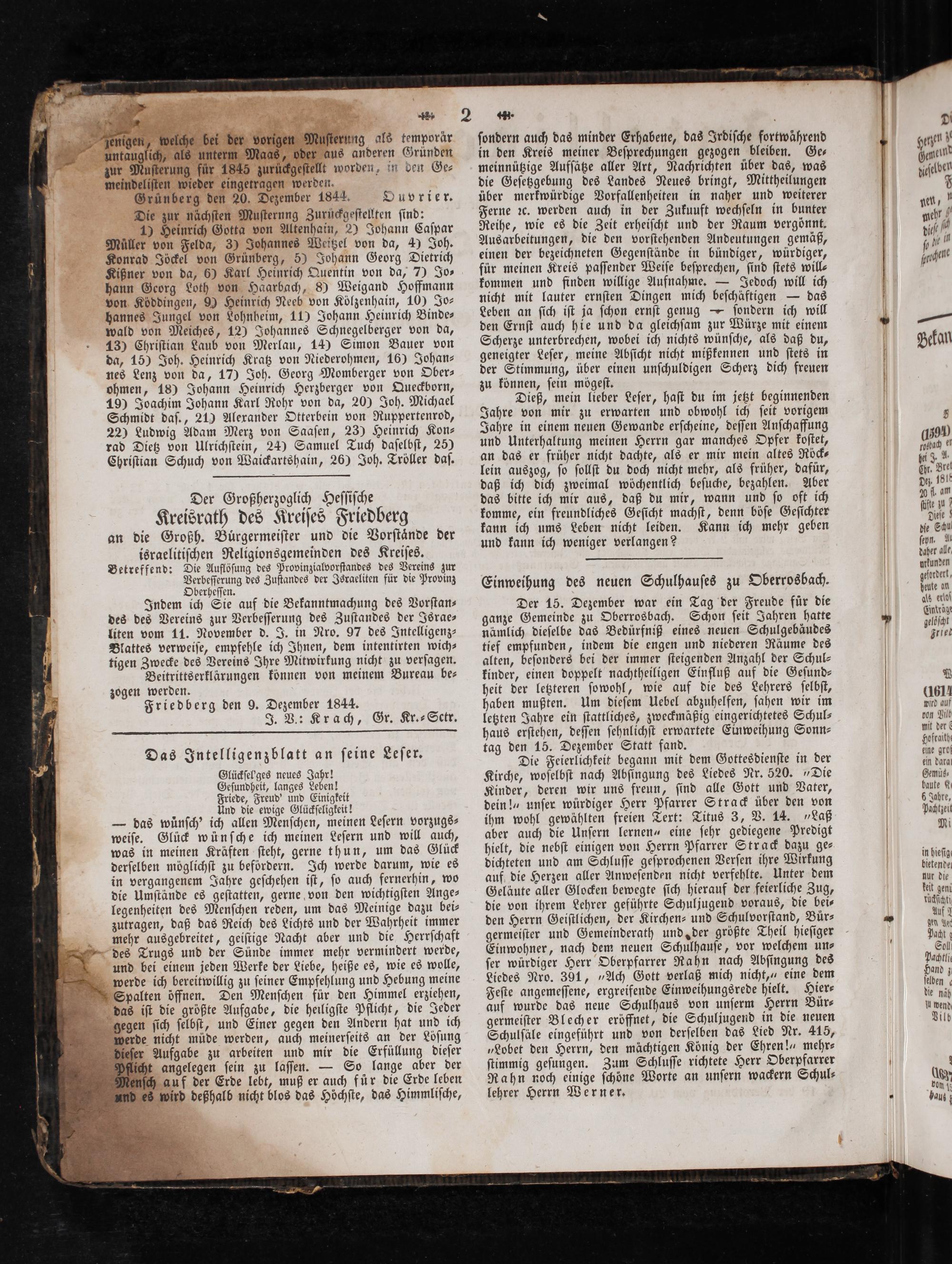 Der Großherzoglich Heſſiſche Kreisrath des Kreiſes Friedberg an die Großh. Buͤrgermeiſter und die Vorſtaͤnde der israelitiſchen Religionsgemeinden des Kreiſes. Betreffend: Die Auflöſung des Provinzialvorſtandes des Vereins zur Verbeſſerung des Zuſtandes der Israeliten für die Provinz Oberheſſen.