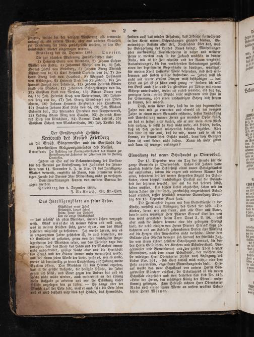 Der 15. Dezember war ein Tag der Freude für die ganze Gemeinde zu Oberrosbach. Schon ſeit Jahren hatte nämlich dieſelbe das Bedürfniß eines neuen Schulgebäudes tief empfunden, indem die engen und niederen Räume des alten, beſonders bei der immer ſteigenden Anzahl der Schul⸗ kinder, einen doppelt nachtheiligen Einfluß auf die Geſund— heit der letzteren ſowohl, wie auf die des Lehrers ſelbſt, haben mußten. Um dieſem Uebel abzuhelfen, ſahen wir im letzten Jahre ein ſtattliches, zweckmäßig eingerichtetes Schul⸗ haus erſtehen, deſſen ſehnlichſt erwartete Einweihung Sonn⸗ tag den 15. Dezember Statt fand.