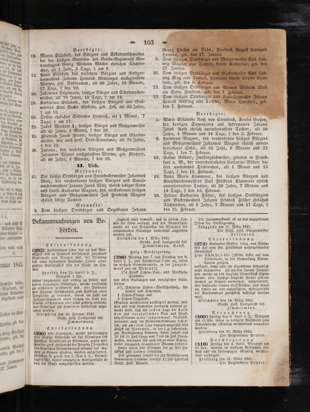 Die Zuſammenkunft iſt an den angegebenen Orten der Verſteigerung. Langgöns am 22. Maͤrz 1845. Der Grßb. Heſſ. Bürgermeiſter Freſenius. Edietal ladung. (372) Katharina Müller, ledig, von Wohn⸗ feld hat vom Gr. Forſtfiscus nachbezeichnetes Grundſtück Flur XXII/35,5 685[IKlftr. Acker auf dem Liſeberbain, in der Gemarkung Boben— hauſen gelegen, verkauft, kann aber ihr Eigenthum urkundlich nicht nachweiſen. Es werden darum Diejeni⸗ gen, welche an das fragliche Grundſtück Eigen⸗ thums- oder ſonſtige dingliche Rechte geltend machen zu können vermeinen, aufgefordert, ihre Anſprüche binnen vier Wochen, von heute an, dahier an- und auszuführen, widrigenfalls der Kaufcontract gerichtlich beſtätigt werden wird. Ulrichſtein den 14. März 1845. Großh. Heſſ. Landgericht daf Zimmermann. Verpachtung. (409) Freitag den 4 April l. J., Morgens um 11 Ubr, ſollen in hieſigem Rathbauſe zehn Schaaſpferche öffentlich meiſtbietend verpachtet werden. Friedberg den 31. Maͤrz 1845. Der Beigeordnete Bender Verſteigerung. (410) Freitag den 4. April, Morgens um 11 Uhr, werden in hieſigem Ratbhauſe eine Kub und ein Leiterwagen öffentlich meiſtbie tend verſteigert. Friedberg den 31. März 1845. Der Beigeordnete Bender