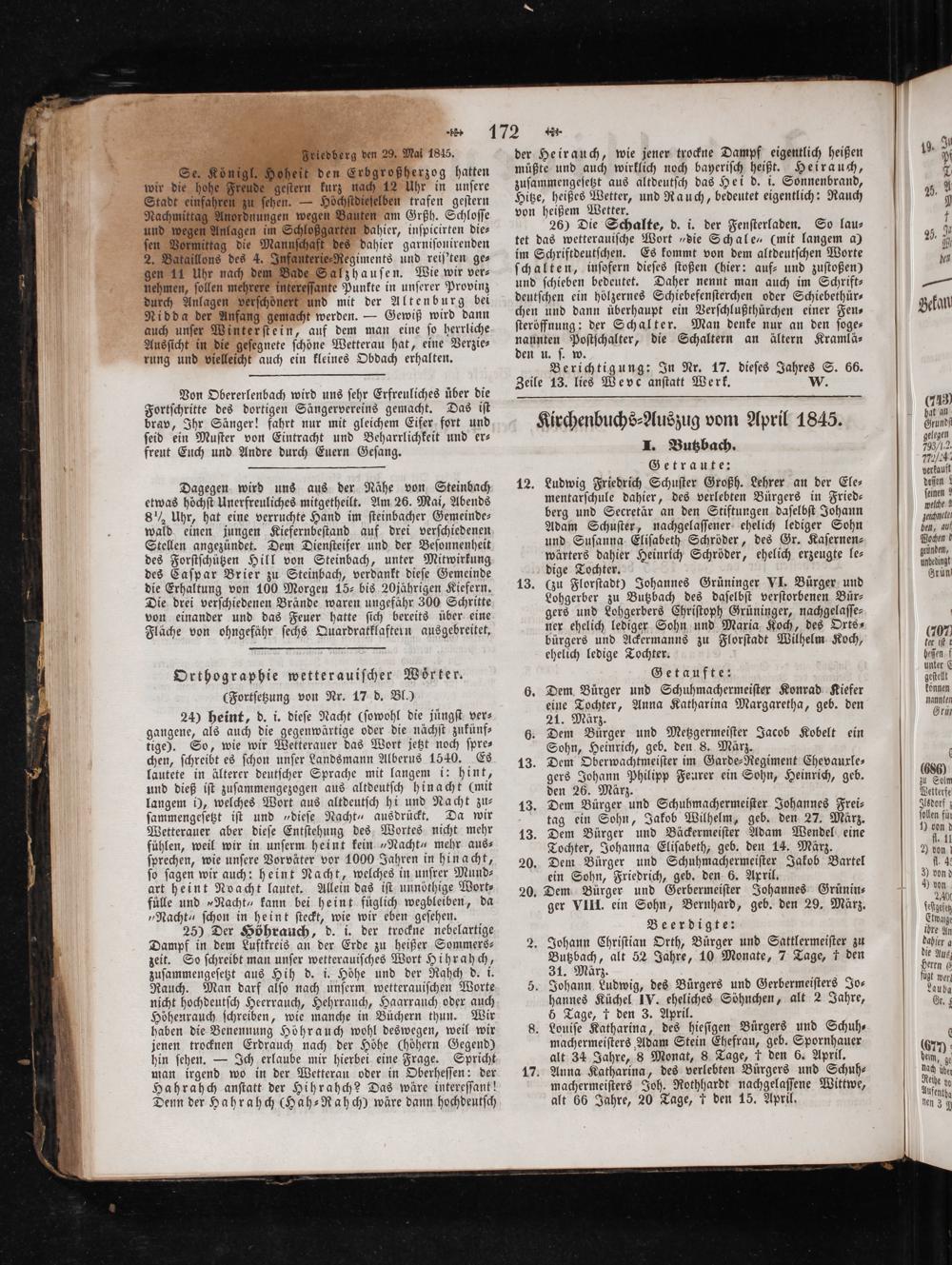 Kirchenbuchs⸗Auszug vom April 1845. I. Butzbach.