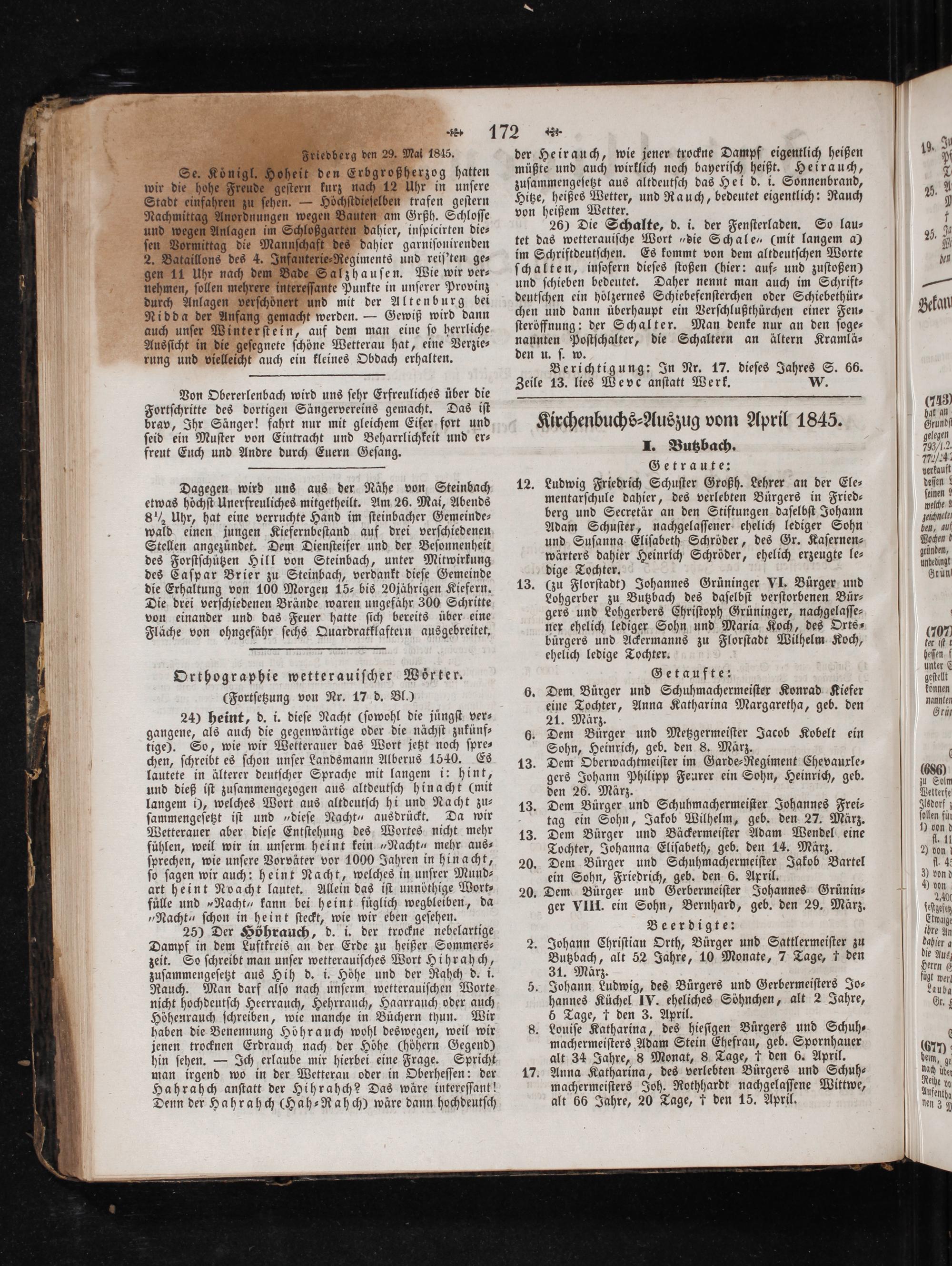 2. Johann Chriſtian Orth, Bürger und Sattlermeiſter zu Butzbach, alt 52 Jahre, 10 Monate, 7 Tage, f den 31. März.