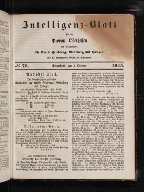 Der Großherzoglich Heſſiſche Kreisrath des Kreiſes Friedberg an ſaͤmmtliche Großh. Buͤrgermeiſter dieſes Kreiſes. Betreffend: Das Wandern deutſcher Handwerksgeſellen in der Schweiz. 5 Nachſtehend theile ich Ihnen, in Folge Miniſterial⸗ Entſchließung, ein Verzeichniß der wegen Theilnahme an