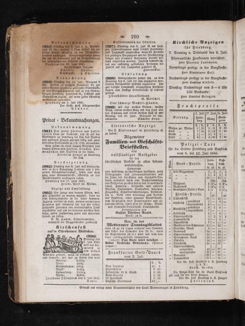 fur die Städte Friedberg und Butzbach vom 6. bis 12. Juli 1845.