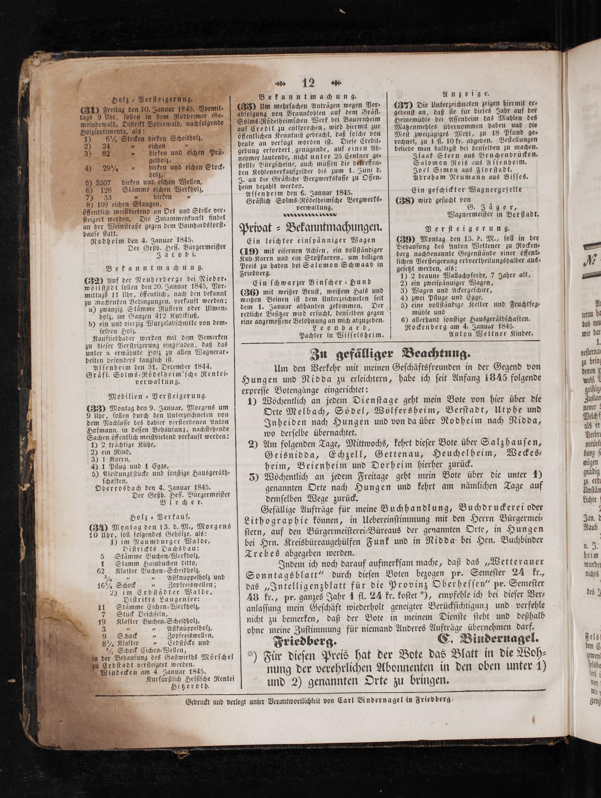 Gedruckt und verlegt unter Verantwortlichkeit von Carl Bindernagel in Friedberg