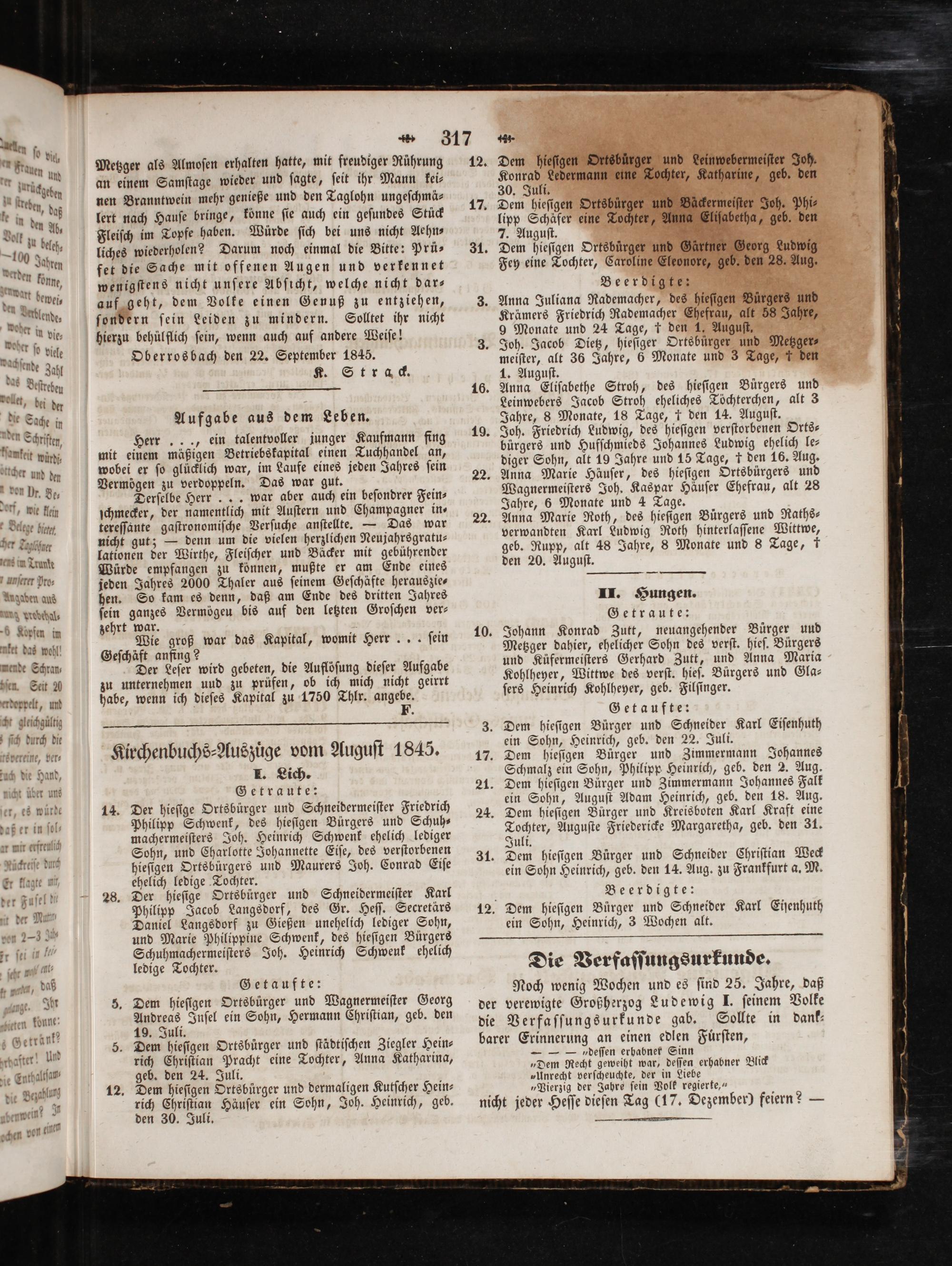 Kirchenbuchs⸗Auszuͤge vom Auguſt 1845.