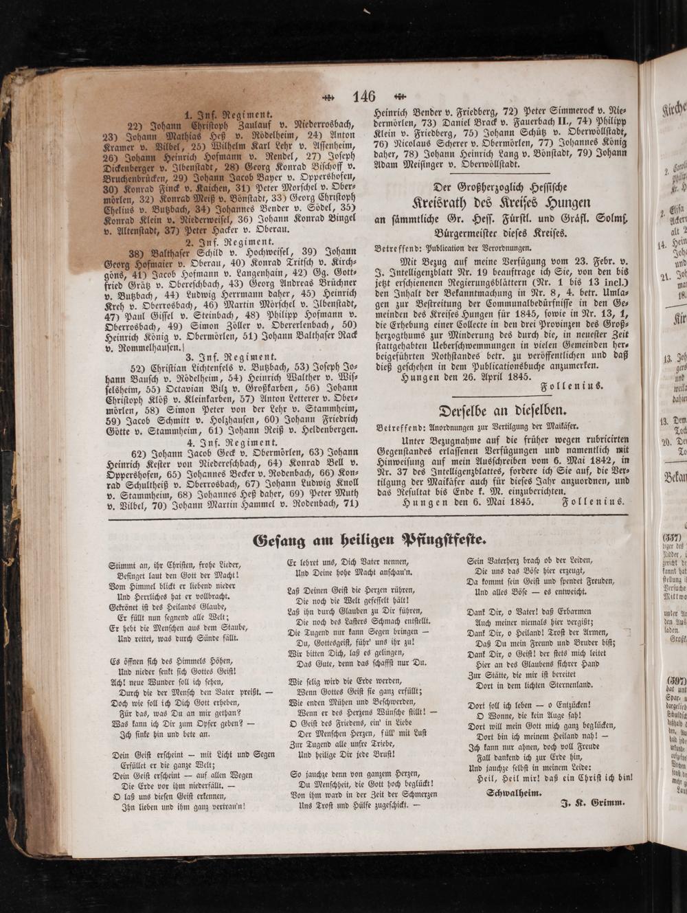 Mit Bezug auf meine Verfügung vom 23. Febr. v. J. Intelligenzblatt Nr. 19 beauftrage ich Sie, von den bis jetzt erſchienenen Regierungsblättern(Nr. 1 bis 13 incl.) den Inhalt der Bekanntmachung in Nr. 8, 4. betr. Umla⸗ gen zur Beſtreitung der Communalbedürfniſſe in den Ge⸗ meinden des Kreiſes Hungen für 1845, ſowie in Nr. 13, 1, die Erhebung einer Collecte in den drei Provinzen des Groß— herzogthums zur Minderung des durch die, in neueſter Zeit ſtattgehabten Ueberſchwemmungen in vielen Gemeinden her— beigeführten Nothſtandes betr. zu veröffentlichen und daß dieß geſchehen in dem Publicationsbuche anzumerken. Hungen den 26. April 1845. Follenius.