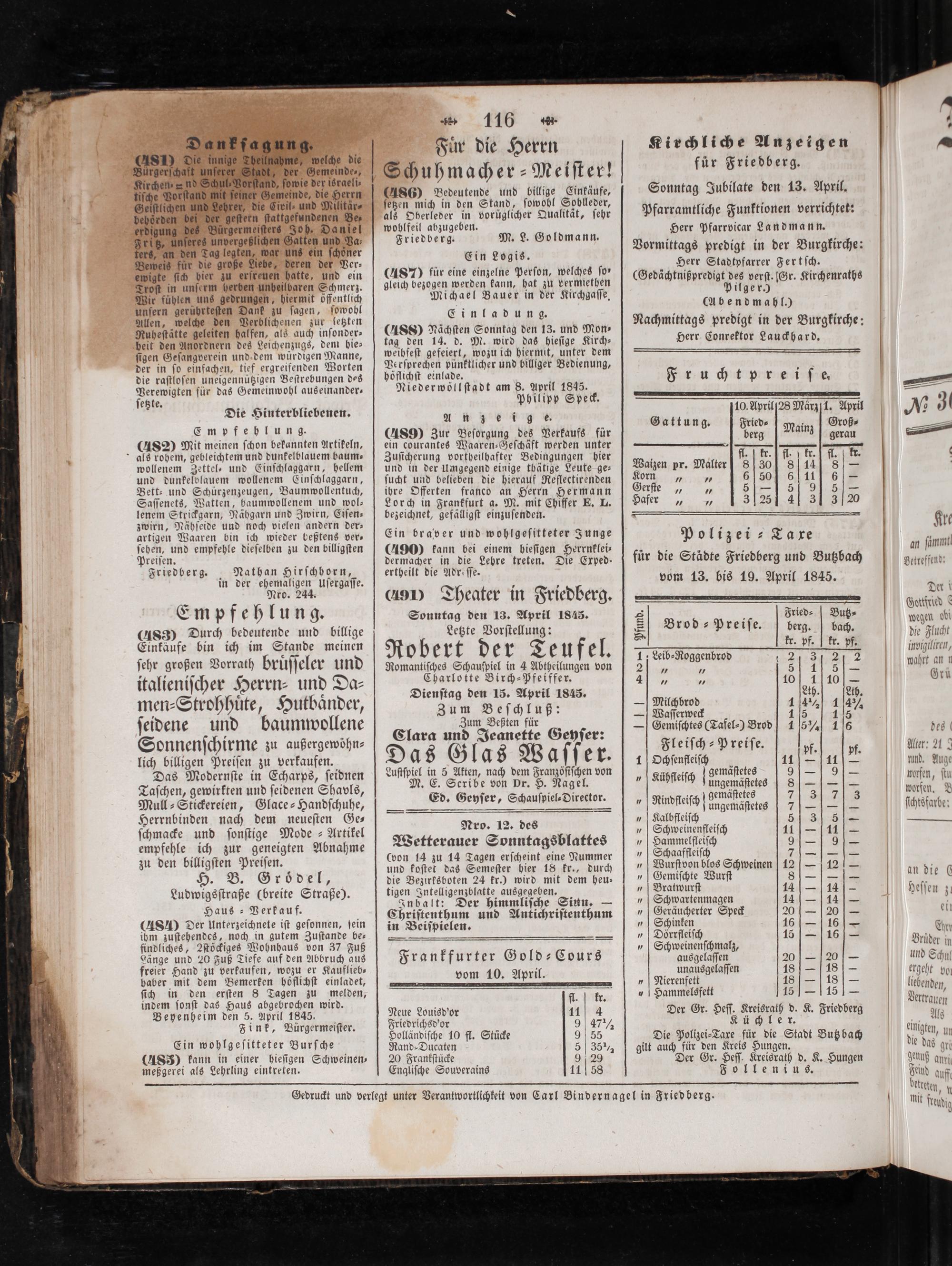 (9) Theater in Friedberg. Sonntag den 13. April 1845. Letzte Vorſtellung: