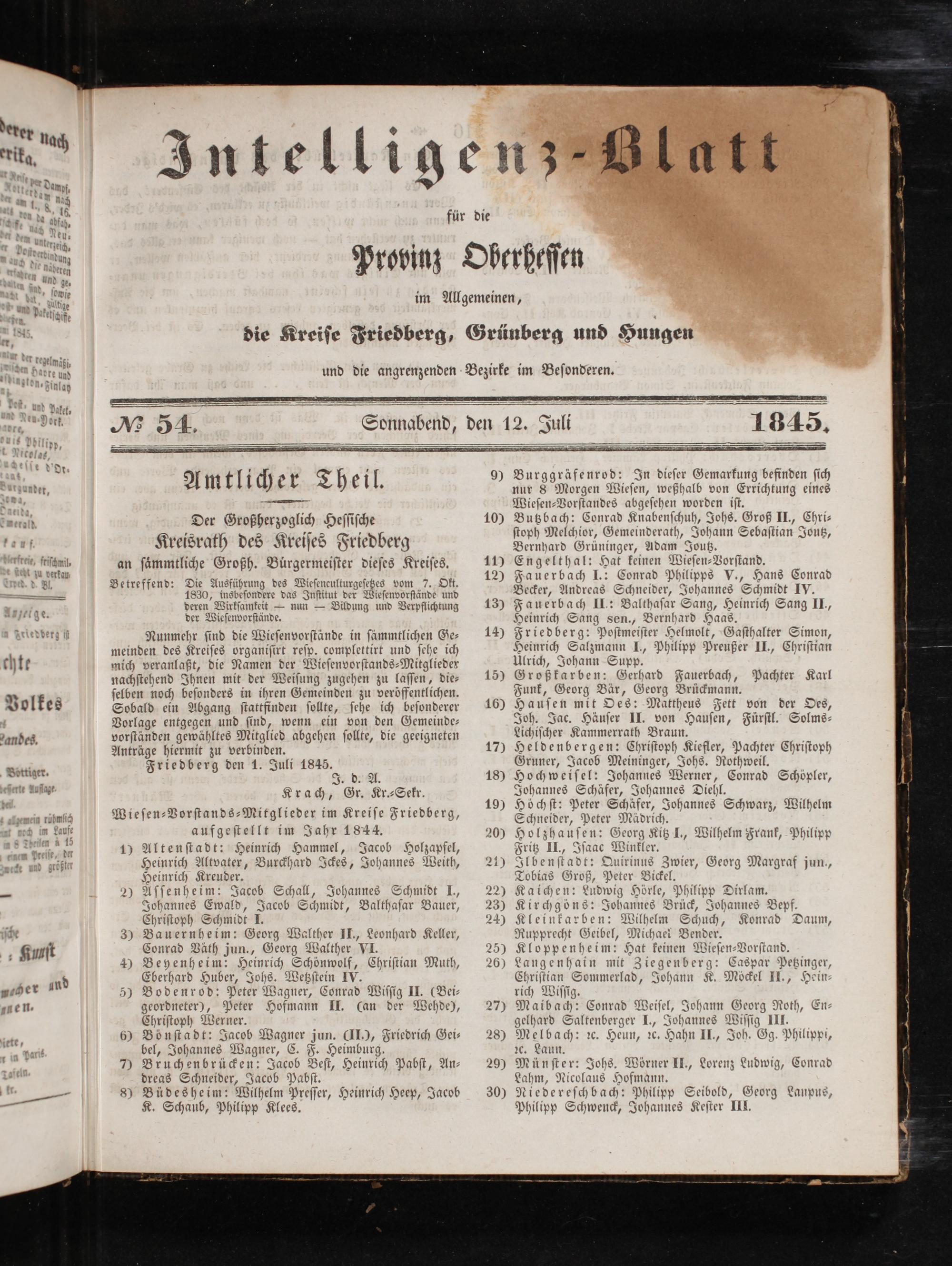 .—.—————— . Sonnabend, den 12. Juli Or* E 7 n 8 4 4 2 feſer. ö 1 ö A m t i ch 1 U ei. 9) Burggräfenr od: In dieſer Gemarkung befinden ſich N et, nur 8 Morgen Wieſen, weßhalb von Errichtung eines N Wieſen-Vorſtandes abgeſehen worden iſt. Enetald Der Großherzoglich Heſſiſche 100 5 105 e Johs. 2555 II., Chri⸗ f 72 N„ ea oph Melchior, Gemeinderath, Johann Sebaſtian Joutz, ö 147 Kreisrath des Kreiſes Friedberg 3 Grüninger, Adam Joutz. l ſrele, ft an ſaͤmmtliche Großh. Buͤrgermeiſter dieſes Kreiſes. 110 Engelthal: Hat keinen Wieſen-Vorſtand. 4 0 0* 0* 8 8 +„58 80 Betreffend: Die Ausführung des Wieſenculturgeſetzes vom 7. Okt. 12 5 5 eee 5 Conrad 2 1830, insbeſondere das Inſtitut der Wieſenvorſtände und ecker, Andreas Schneider, Johannes Schmidt IV. 1 deren Wirkſamkeit— nun— Bildung und Verpflichtung 13) Fauerbach II.: Balthaſar Sang, Heinrich Sang II., 8 der Wieſenvorſtände. Heinrich Sang sen., Bernhard Haas. 9 f Nunmehr ſind die Wieſenvorſtände in ſämmtlichen Ge⸗ 14) Friedberg: Poſtmeiſter Helmolt, Gaſthalter Simon, ö meinden des Kreiſes organiſirt reſp. complettirt und ſehe ich Heinrich Salzmann I., Philipp Preußer II., Chriſtian** chte mich veranlaßt, die Namen der Wieſenvorſtands-Mitglieder Ulrich, Johann Supp. 5 nachſtehend Ihnen mit der Weiſung zugehen zu laſſen, die- 15) Gr oßkarben: Gerhard Fauerbach, Pachter Karl * ſelben noch beſonders in ihren Gemeinden zu veröffentlichen. Funk, Georg Bär, Georg Brückmann. 8 ö Volkes Sobald ein Abgang ſtattfinden ſollte, ſehe ich beſonderer 16) Hauſen mit Oes: Mattheus Fett von der Oes, ö Vorlage entgegen und ſind, wenn ein von den Gemeinde— Joh. Jac. Häuſer II. von Hauſen, Fürſtl. Solms⸗ 1 vandes. vorſtänden gewähltes Mitglied abgehen ſollte, die geeigneten Lichiſcher Kammerrath Braun. f ö Anträge hiermit zu verbinden. 17) Heldenbergen: Chriſtoph Kiefler, Pachter Chriſtoph n Friedberg den 1. Juli 1845. Gruner, Jacob Meininger, Johs. Rothweil. N erb e J. d. A. 18) Hochweiſel: Johannes Werner, Conrad Schöpler, 1 * Krach, Gr. Kr.⸗Sekr. Johannes 5 Johannes Diehl. 2 8 ö N 5 Pete. 0 8 S, Wilhe tübnic Wieſen⸗Vorſtands-Mitglieder im Kreiſe Friedberg, 15 S. n ö geufe aufgeſtellt im Jahr 1844. 20) Holzhauſen: Georg Kitz I., Wilhelm Frank, Philipp ö . 1) Altenſtadt: Heinrich Hammel, Jacob Holzapfel, Fritz II., Iſaae Winkler. Heinrich Altvater, Burckhard Ickes, Johannes Weith, 21) Ilbenſtadt: Quirinus Zwier, Georg Margraf jun., Heinrich Kreuder. Tobias Groß, Peter Bickel.. 0 2) Aſſenheim: Jacob Schall, Johannes Schmidt I., 22) Kaichen: Ludwig Hörle, Philipp Dirlam. N Johannes Ewald, Jacob Schmidt, Balthaſar Bauer, 23) Kirchgöns: Johannes Brück, Johannes Bepf. 1 Chriſtoph Schmidt J. 24) Kleinkarben: Wilhelm Schuch, Konrad Daum, he 3) Bauernheim: Georg Walther II., Leonhard Keller, Rupprecht Geibel, Michael Bender. 7 Kunſt Conrad Väth Jun., Georg Walther VI. 25) Kloppenheim: Hat keinen Wieſen⸗Vorſtand. . 4) Beyenheim: Heinrich Schönwolf, Chriſtian Muth, 26) Langenhain mit Ziegenberg: Caspar Petzinger, and Eberhard Huber, Johs. Wetzſtein IV. 8 Chriſtian Sommerlad, Johann K. Möckel II., Hein 0 nacher 1 5) Bodenrod: Peter Wagner, Conrad Wiſſig II.(Bei— rich Wiſſig. 0 gen. geordneter), Peter Hofmann II.(an der Wehde), 27) Maibach: Conrad Weiſel, Johann Georg Roth, En— 0 Chriſtoph Werner. gelhard Saltenberger I., Johannes Wiſſig III. 1 6) Bönſtadt: Jacob Wagner jun.(II.), Friedrich Gei⸗ 28) Melbach: ꝛc. Heun, ꝛc. Hahn II., Joh. Gg. Philippi, g bel, Johannes Wagner, C. F. Heimburg. ꝛc. Laun. N 7) Bruchenbrücken: Jacob Beſt, Heinrich Pabſt, An— 29) Münſter: Johs. Wörner II., Lorenz Ludwig, Conrad dreas Schneider, Jacob Pabſt. Lahm, Nicolaus Hofmann.