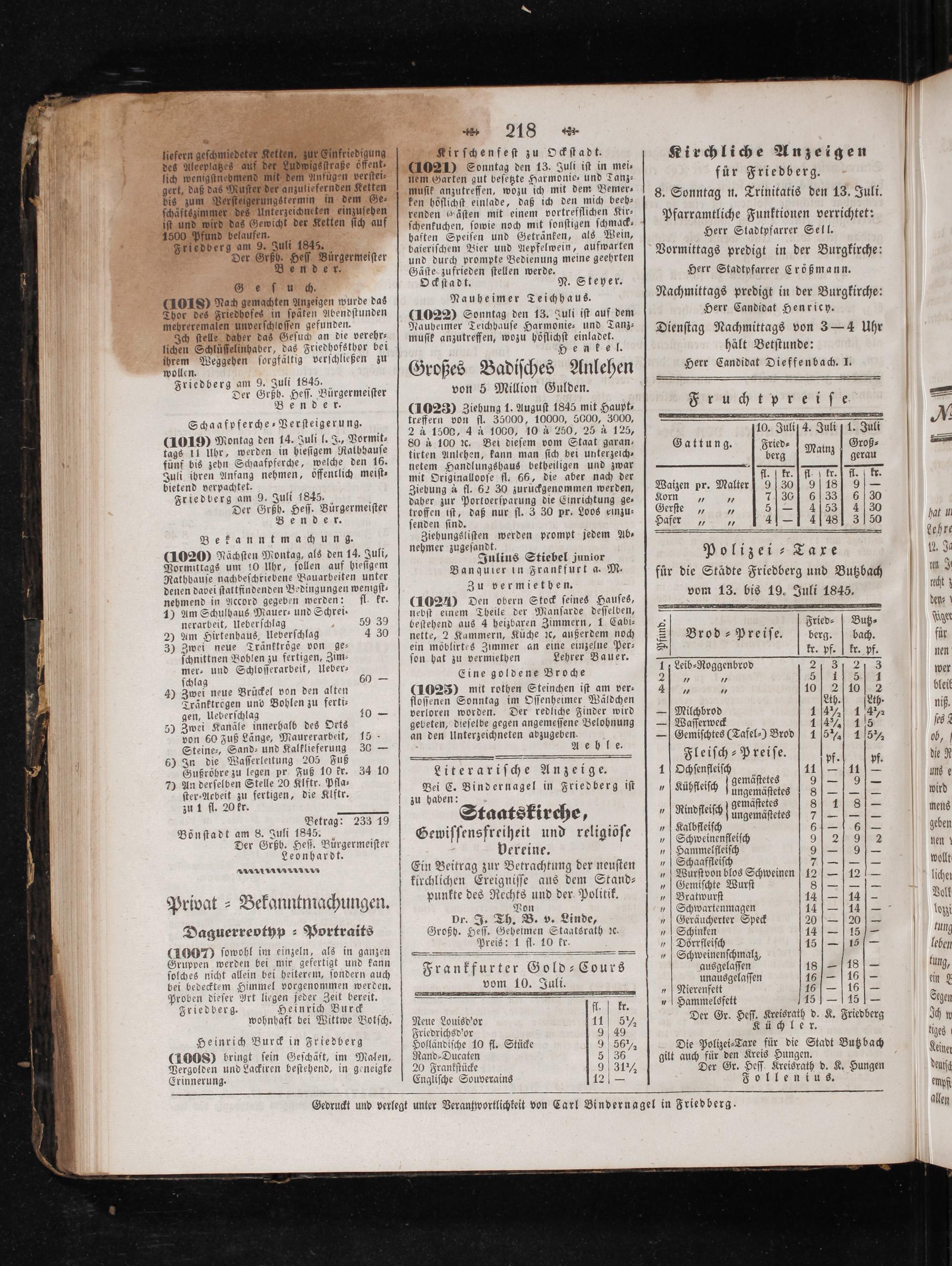 Friedberg am 9. Juli 1845. g Der Grßh. Heſſ. Bürgermeiſter Bender.