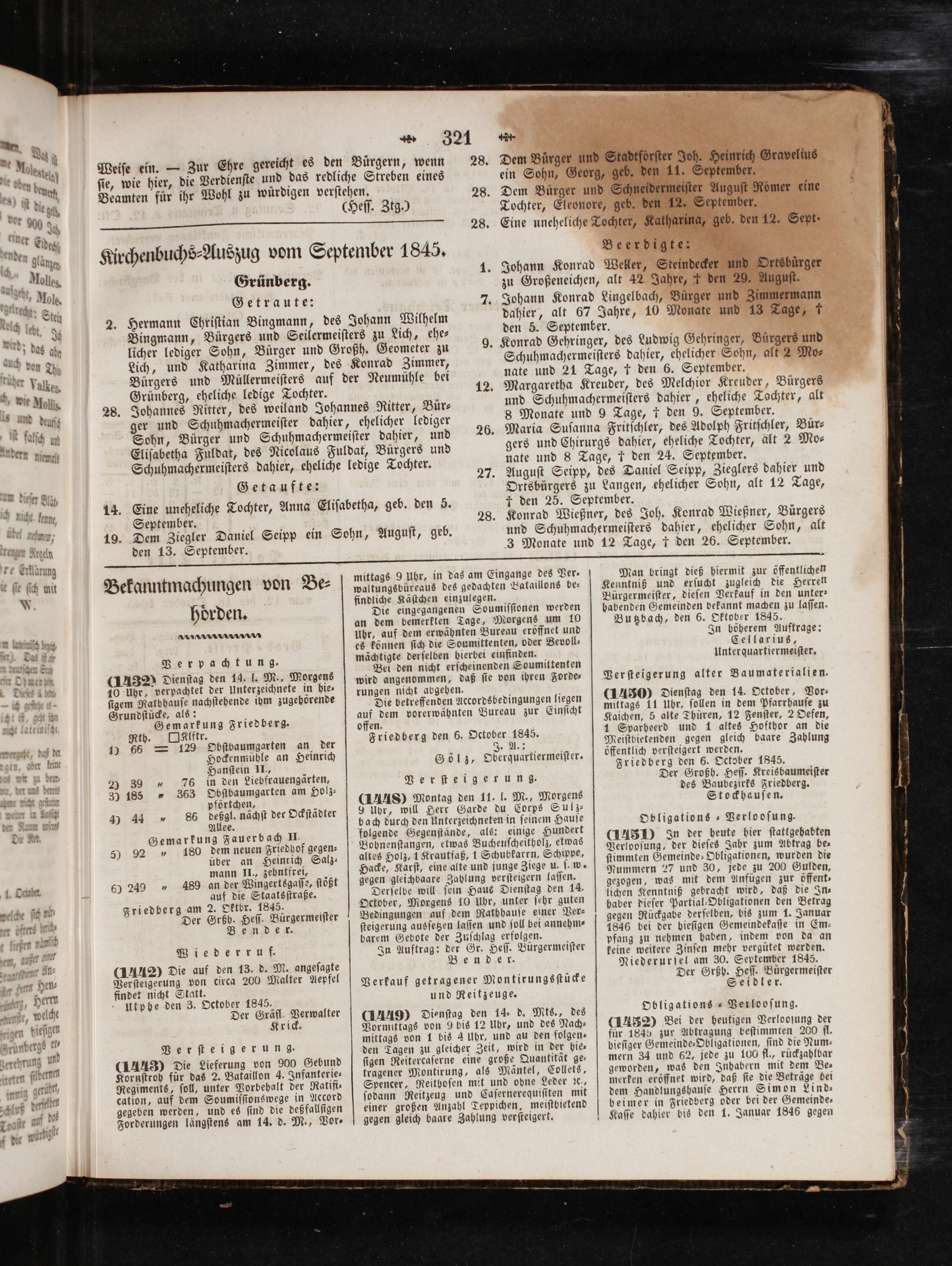 Bingmann, licher lediger Sohn, Bürger und Großh. Geometer zu Lich, und Katharina Zimmer, des Konrad Zimmer, Bürgers und Müllermeiſters auf der Neumühle bei Grünberg, eheliche ledige Tochter. Johannes Ritter, ger und Schuhmachermeiſter dahier, ehelicher lediger Sohn, Bürger und Schuhmachermeiſter dahier, und Eliſabetha Fuldat, Schuhmachermeiſters dahier, Getaufte: