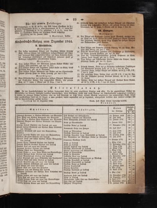 Kapital ⸗ Datum 5 Schuldner. Gläubiger. der Einträg größe. er Einträge. f. cc. Johannes Krammer u. Ehefrau Eliſabetha von Wetterfeld] Feiſt Amſchel von Ettingsbauſen 19. Februar 1818 110— Peter Wiehl und Ehefrau Kunigunde von Wetterfeld Johannes Schmidt von Wetterfeld 16. Juli 1806 200 2 —— Ehefrau Anna Catharina von Wetterfeld] Anna Margaretha Hofmann von Laubach 12. Januar 1791 40— ohannes Wagne Ehef ge e von Einarts⸗ 7 8 J 8 gner und Ehefrau Gertraude von Einarts⸗ Kirche zu Einartsbauſen 1. Januar 1820 250 2 hauſel 3. 1 . 8 von Laubach und uxor Gräfliche Rentel zu Laubach 17. November 17611 22* Johann Kaſpar Abendroth und Ehefrau Anna Eliſabetha—. z 118 von Villingen 0 a Eliſabethaf Kammerath Seipp von Hungen 18. Juli 1817 4 2 Chriſtoph Abendroth und uxor von Ruppertsburg Kirche zu Münzenberg 17. Juni 1788 30— Dieſelben. 5 Gräfliche Amtsrente zu Laubach 14. Juli 1786 8 22 Johann Heinrich Bender und uxor von Ruppertsburg Gräfliche Chatullen⸗ resp. Almoſenkaſſe zu Laubach 30. October 1738 12⁰* ————— Die Vormünder der Weiliſchen Kinder zu Stornfels J 23. Juli 1776 50— omas Becht und deſſen Ehefrau Maria Margaretha dau 9. Fel 77 f f* 3 iane 9. Februar 1771 30— von Laubach Comtesse Chriſtiane Loulſe 8 Johann Georg Zimmers Eheleute von Laubach Kirche zu Laubach 2. März 1743[ 38 50 Heinrich Wilhelm Kreickers Eheleute von Laubach Kirche zu Laubach 23. November 1792 100— Gottlieb Bock und uxor von Laubach Jungfer Schmall von Laubach 17. März 1785 8— Johannes Kreickers Eheleute von Laubach Gräfliche Almoſencaſſe zu Laubach 19. März 1790 192— Wilhelm Schad von Ruppertsburg Pfarrer Hennemann von Ruppertsburg 2. Marz 1786 25— Contad Böcher u. uxor Anna Maria von Gonterskirchen] Kirche zu Gonterskirche 24. Juni 1800 2018 Johann Thomas Kochs Eheleute von Laubach Kirche zu Wetterſeld 1. Februar 1743 20— Konrad Neunobel und Ehefrau von Laubach Hoffriſeur Roos von Laubach 29. November 1787] 50— Caſpar Hirzinger und uxor Wilhelmine von Tralshorloff] Frau Hofkammerath Scheuermann zu Mosbach 12. Mai 1800. 2 Thomas Becht und deſſen Ehefrau zu Laubach Gräfliche Renteikaſſe zu Laubach 6. Januar 1778 50— Conrad Neunobel jun. und uxor von Laubach Gräfliche Almoſenkaſſe zu Laubach. Juni 1757 8130 Johann Wilhelm Hildebrand und uxor von Laubach Gräfliche Rentei zu Laubach 14. April 1755 60— Joſt Ulbohn und uxor von Utphe Pfarrey Traishorloff 21. Februar 1800 9033 Konrad Möll und uxor von Freienſeen Pfarrey Freienſeen 8. Mai 1738 30— — Lenz und 2 von 8 f Gräfliche Amtsrente zu Laubach 25. April 1778 930 ohannes Freimann und Ehefrau Anna Catharin n 75: 117 Laubach bef en eee Gräfliche Rentei zu Laubach 9. Mai 1741 501— Konrad Jochem und uxor von Laubach Kaufmann Hold von Laubach 28. November 17941 50— Georg Jach und uxor von Laubach Kirche zu Laubach 23. Dezember 1779 100 2 N 2 1„Taub. e 458— 5 Johann Heinrich Becht und uxor von Gonterskirchen Waſenmeiſter Jakob Hirt von Gonterskirchen 4. Juni 1777 25— K 8. 5 8 813 konrad Becht und uxor von Laubach Herz Katz von Laubach 3. September 1813 400— Ludwig Friedrich Römer und axor von Ruppertoburg] Pflegerey Münzenberg 12. Januar 1789 300