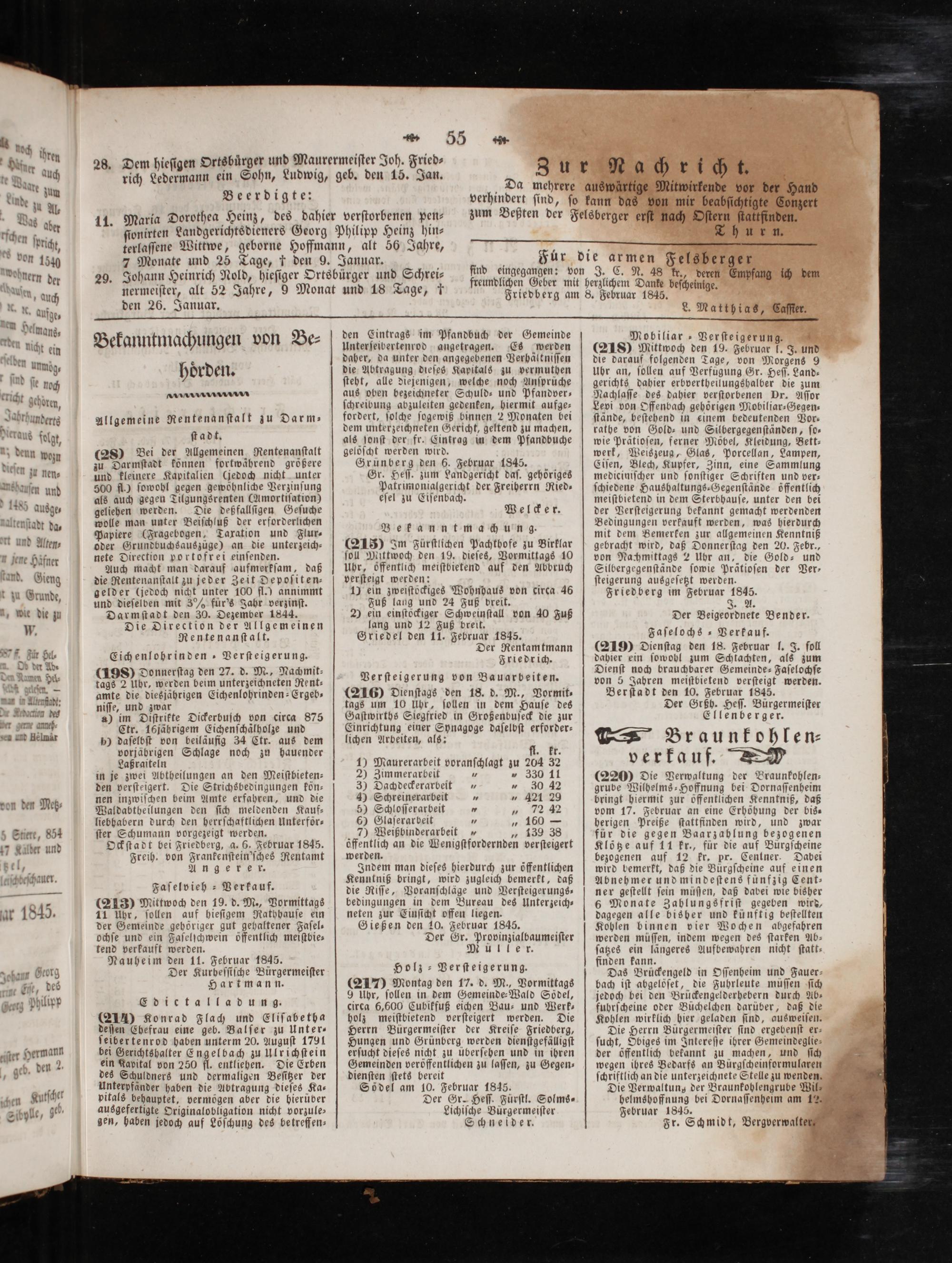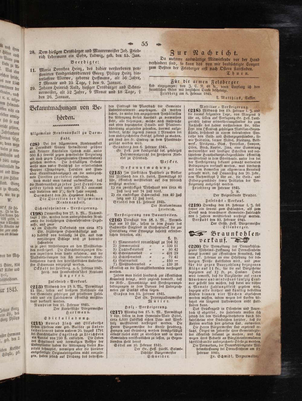 (198) Donnerſtag den 27. d. M., Nachmit⸗ tags 2 Uhr, werden beim unterzeichneten Rent⸗ amte die diesjährigen Eichenlohrinden-Ergeb— niſſe, und zwar f a) im Diſtrikte Dickerbuſch von circa 875 Ctr. 16jährigem Eichenſchaͤlholze und p) daſelbſt von beiläufig 34 Ctr. aus dem vorjäbrigen Schlage noch zu hauender Laßraiteln in je zwei Abtheilungen an den Meiſtbieten— den verſteigert. Die Strichsbedingungen kön— nen inzwiſchen beim Amte erfahren, und die Waldabtheilungen den ſich meldenden Kauf— liebhabern durch den herrſchaftlichen Unterför— ſter Schumann vorgezeigt werden. Ockſtadt bei Friedberg, a. 6. Februar 1845. Freih. von Frankenſtein'ſches Rentamt An ge de x.