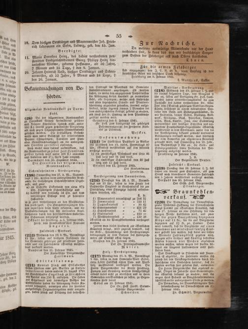 Holz-⸗Verſteigerung. (217) Montag den 17. d. M., Vormittags 9 Uhr, ſollen in dem Gemeinde-Wald Södel, circa 6,600 Cubikfuß eichen Bau- und Werk⸗ holz meiſtbietend verſteigert werden. Die Herrn Bürgermeiſter der Kreiſe Friedberg, Hungen und Grünberg werden dienſtgefälligſt erſucht dieſes nicht zu überſehen und in ihren Gemeinden veröffentlichen zu laſſen, zu Gegen⸗